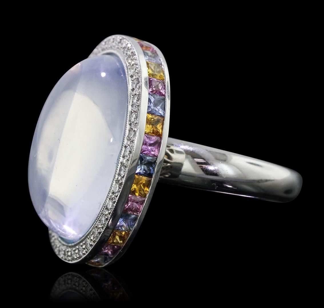 One electronically tested 18KT white gold ladies cast opal, multi-color sapphire & diamond ring. Condition is good. The featured opal is set within a diamond bezel supported by a multi-color sapphire under gallery, completed by a four millimeter wide band. Bright polish finish with milgrain detailing. Identified with markings of "18KT 750". Containing: One jelly opal that is cut in a oval shape and is bezel set, measuring 26.50 mm long x 22.00 mm wide, and 8.50 mm thick and the approximate weight is 21.49 carats. The opal has a , play of color (fire) in a pattern; a dome; a cut; in its brightness and pattern; and is. Refractive index testing results of 1.45. This is a conclusive result for opal. Graded in the setting. Thirty-three channel set square brilliant cut natural multi-color sapphires, measuring 2.90 x 2.80 x 1.85mm, approximate. Total Weight of 5.05ct., clarity is slightly included, cut is good. Transmitting light with a minimum of distortion, transparent. Naturally occurring internal & external characteristics are present. Measurements are an average for the group. The group is composed of a mix of natural pink, yellow and violet color sapphires. Graded in the setting. Thirty-Six bead set round brilliant cut diamonds, measuring 1.90 - 1.80 x 1.11mm (depth est.) approximate. Total Weight of 36 Stones = 0.93ct. Graded in the setting. Clarity: VS-2 to SI-2. Color: H - J. Total Weight of Colored Stones 5.05ct. Total Weight of Diamonds 0.93ct. Total Weight of Opals 21.49ct. Total Weight of Ring 33.88 grams. AIG Appraised at $14,870.00.
