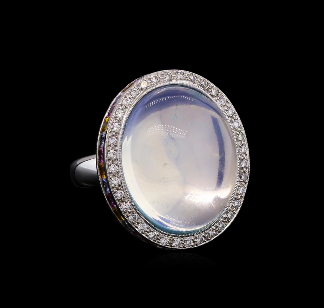 One electronically tested 18KT white gold ladies cast opal, multi-color sapphire & diamond ring. Condition is good. The featured opal is set within a diamond bezel supported by a multi-color sapphire under gallery, completed by a four millimeter wide band. Bright polish finish with milgrain detailing. Identified with markings of "18KT 750". Containing: One jelly opal that is cut in a oval shape and is bezel set, measuring 26.50 mm long x 22.00 mm wide, and 8.50 mm thick and the approximate weight is 21.49 carats. The opal has a , play of color (fire) in a pattern; a dome; a cut; in its brightness and pattern; and is. Refractive index testing results of 1.45. This is a conclusive result for opal. Graded in the setting. Thirty-three channel set square brilliant cut natural multi-color sapphires, measuring 2.90 x 2.80 x 1.85mm, approximate. Total Weight of 5.05ct., clarity is slightly included, cut is good. Transmitting light with a minimum of distortion, transparent. Naturally occurring internal & external characteristics are present. Measurements are an average for the group. The group is composed of a mix of natural pink, yellow and violet color sapphires. Graded in the setting. Thirty-Six bead set round brilliant cut diamonds, measuring 1.90 - 1.80 x 1.11mm (depth est.) approximate. Total Weight of 36 Stones = 0.93ct. Graded in the setting. Clarity: VS-2 to SI-2. Color: H - J. Total Weight of Colored Stones 5.05ct. Total Weight of Diamonds 0.93ct. Total Weight of Opals 21.49ct. Total Weight of Ring 33.88 grams. AIG Appraised at $14,870.00.
