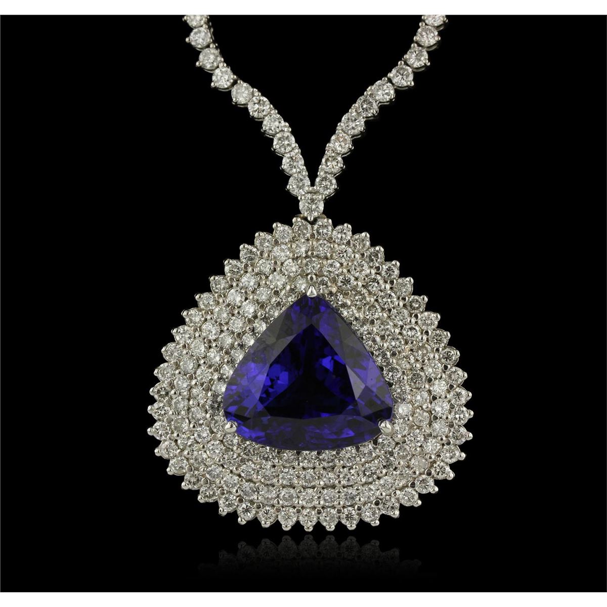 One electronically tested 18KT white gold Ladies combination cast & assembled necklace with a hidden box clasp with a bright polish finish. Condition is new. Measurements: 16" in length. Identified with markings of "750". Containing: One prong set triangle modified brilliant cut natural tanzanite, measuring 18.70 x 19.74 x 10.72mm, exact weight 24.23ct., clarity is eye clean, type I, medium dark, moderately strong, violetish blue color, (GIA vB 6/4), cut is very good. GIA Report: 1156735048. Three Hundred Twenty-Four prong set round brilliant cut diamonds, measuring 2.80 - 2.00 x 1.44mm (depth est.) approximate. Total Weight of 324 Stones = 16.39ct. Clarity: SI-2 to I-2. Color: I - K, Cut is Good. Total Weight of Colored Stones 24.23ct. Total Weight of Diamonds 16.39ct. Total Weight of Necklace 36.50 grams. GGL Appraised at $72,340.00.