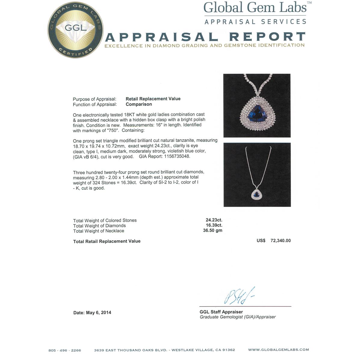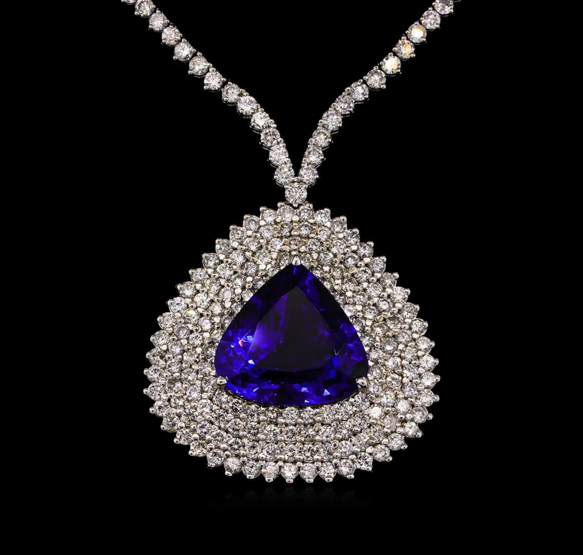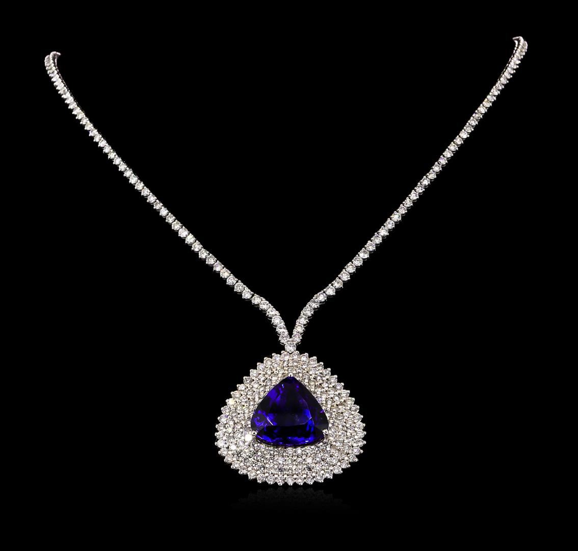 One electronically tested 18KT white gold Ladies combination cast & assembled necklace with a hidden box clasp with a bright polish finish. Condition is new. Measurements: 16" in length. Identified with markings of "750". Containing: One prong set triangle modified brilliant cut natural tanzanite, measuring 18.70 x 19.74 x 10.72mm, exact weight 24.23ct., clarity is eye clean, type I, medium dark, moderately strong, violetish blue color, (GIA vB 6/4), cut is very good. GIA Report: 1156735048. Three Hundred Twenty-Four prong set round brilliant cut diamonds, measuring 2.80 - 2.00 x 1.44mm (depth est.) approximate. Total Weight of 324 Stones = 16.39ct. Clarity: SI-2 to I-2. Color: I - K, Cut is Good. Total Weight of Colored Stones 24.23ct. Total Weight of Diamonds 16.39ct. Total Weight of Necklace 36.50 grams. GGL Appraised at $72,340.00.