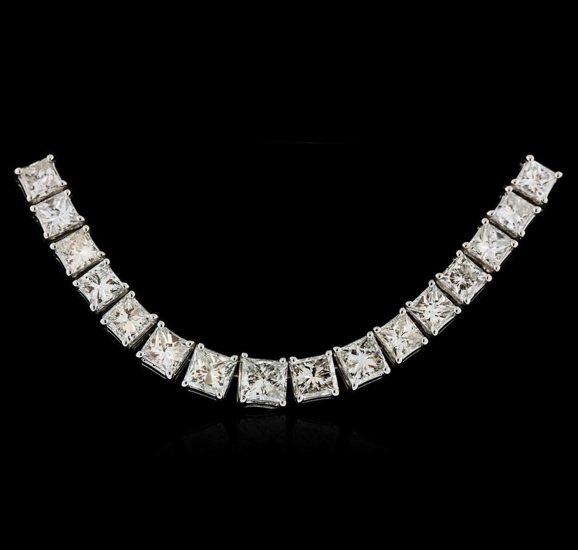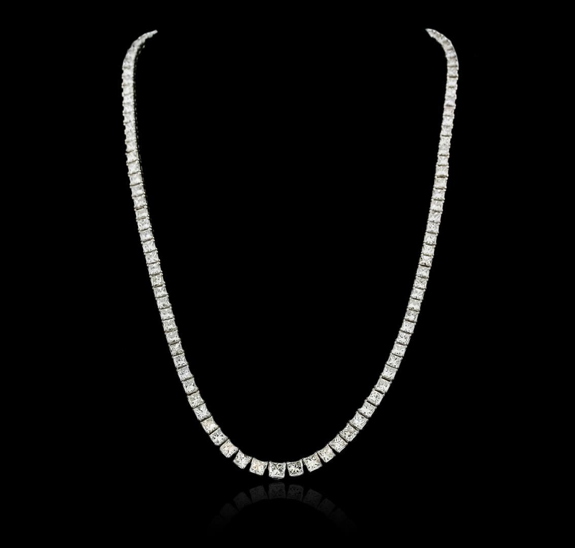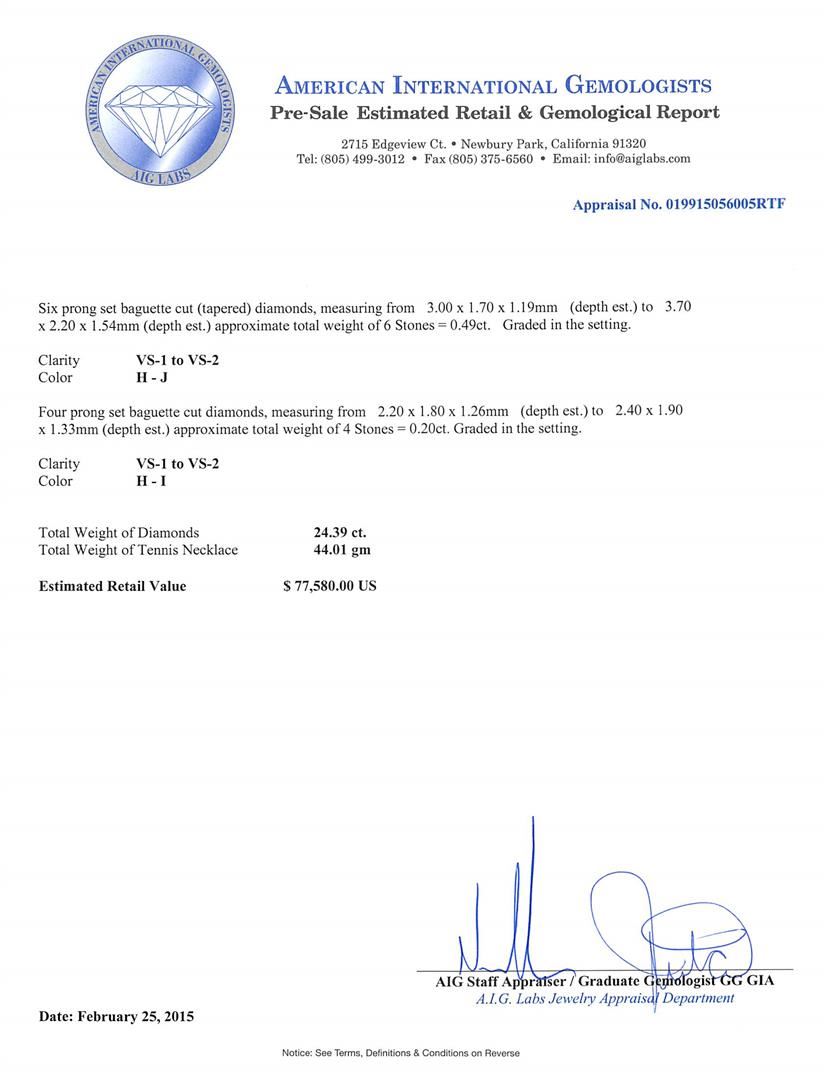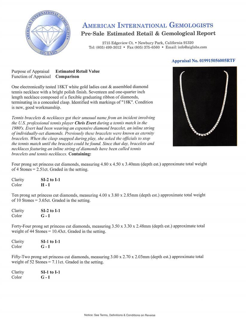 One electronically tested 18KT white gold ladies cast & assembled diamond tennis necklace with a bright polish finish. Seventeen and one-quarter inch length necklace composed of a flexible graduating ribbon of diamonds, terminating in a concealed clasp. Identified with markings of "18K". Condition is new, good workmanship. Tennis bracelets & necklaces got their unusual name from an incident involving the U.S. professional tennis player Chris Evert during a tennis match in the 1980's. Evert had been wearing an expensive diamond bracelet, an inline string of individually-set diamonds. Previously these bracelets were known as eternity bracelets. When the clasp snapped during play, she asked the officials to stop the tennis match until the bracelet could be found. Since that day, bracelets and necklaces featuring an inline string of diamonds have been called tennis bracelets and tennis necklaces. Containing: Four prong set princess cut diamonds, measuring 4.80 x 4.50 x 3.40mm (depth est.) approximate total weight of 4 Stones = 2.51ct. Graded in the setting. Clarity: SI-2 to I-1. Color: H - I Ten prong set princess cut diamonds, measuring 4.00 x 3.80 x 2.85mm (depth est.) approximate total weight of 10 Stones = 3.65ct. Graded in the setting. Clarity: SI-2 to I-1. Color: G - I Forty-Four prong set princess cut diamonds, measuring 3.50 x 3.30 x 2.48mm (depth est.) approximate total weight of 44 Stones = 10.43ct. Graded in the setting. Clarity: SI-1 to I-1. Color: G - I Fifty-Two prong set princess cut diamonds, measuring 3.00 x 2.70 x 2.03mm (depth est.) approximate total weight of 52 Stones = 7.11ct. Graded in the setting. Clarity: SI-1 to I-1. Color: G - I Six prong set baguette cut (tapered) diamonds, measuring from 3.00 x 1.70 x 1.19mm (depth est.) to 3.70 x 2.20 x 1.54mm (depth est.) approximate total weight of 6 Stones = 0.49ct. Graded in the setting. Clarity: VS-1 to VS-2. Color: H - J Four prong set baguette cut diamonds, measuring from 2.20 x 1.80 x 1.26mm (depth est.) to 2.40 x 1.90 x 1.33mm (depth est.) approximate total weight of 4 Stones = 0.20ct. Graded in the setting. Clarity: VS-1 to VS-2. Color: H - I. Total Weight of Diamonds 24.39ct. Total Weight of Tennis Necklace 44.01 grams. AIG Appraised at $77,580.00.