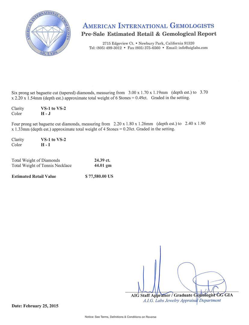 One electronically tested 18KT white gold ladies cast & assembled diamond tennis necklace with a bright polish finish. Seventeen and one-quarter inch length necklace composed of a flexible graduating ribbon of diamonds, terminating in a concealed clasp. Identified with markings of "18K". Condition is new, good workmanship. Tennis bracelets & necklaces got their unusual name from an incident involving the U.S. professional tennis player Chris Evert during a tennis match in the 1980's. Evert had been wearing an expensive diamond bracelet, an inline string of individually-set diamonds. Previously these bracelets were known as eternity bracelets. When the clasp snapped during play, she asked the officials to stop the tennis match until the bracelet could be found. Since that day, bracelets and necklaces featuring an inline string of diamonds have been called tennis bracelets and tennis necklaces. Containing: Four prong set princess cut diamonds, measuring 4.80 x 4.50 x 3.40mm (depth est.) approximate total weight of 4 Stones = 2.51ct. Graded in the setting. Clarity: SI-2 to I-1. Color: H - I Ten prong set princess cut diamonds, measuring 4.00 x 3.80 x 2.85mm (depth est.) approximate total weight of 10 Stones = 3.65ct. Graded in the setting. Clarity: SI-2 to I-1. Color: G - I Forty-Four prong set princess cut diamonds, measuring 3.50 x 3.30 x 2.48mm (depth est.) approximate total weight of 44 Stones = 10.43ct. Graded in the setting. Clarity: SI-1 to I-1. Color: G - I Fifty-Two prong set princess cut diamonds, measuring 3.00 x 2.70 x 2.03mm (depth est.) approximate total weight of 52 Stones = 7.11ct. Graded in the setting. Clarity: SI-1 to I-1. Color: G - I Six prong set baguette cut (tapered) diamonds, measuring from 3.00 x 1.70 x 1.19mm (depth est.) to 3.70 x 2.20 x 1.54mm (depth est.) approximate total weight of 6 Stones = 0.49ct. Graded in the setting. Clarity: VS-1 to VS-2. Color: H - J Four prong set baguette cut diamonds, measuring from 2.20 x 1.80 x 1.26mm (depth est.) to 2.40 x 1.90 x 1.33mm (depth est.) approximate total weight of 4 Stones = 0.20ct. Graded in the setting. Clarity: VS-1 to VS-2. Color: H - I. Total Weight of Diamonds 24.39ct. Total Weight of Tennis Necklace 44.01 grams. AIG Appraised at $77,580.00.