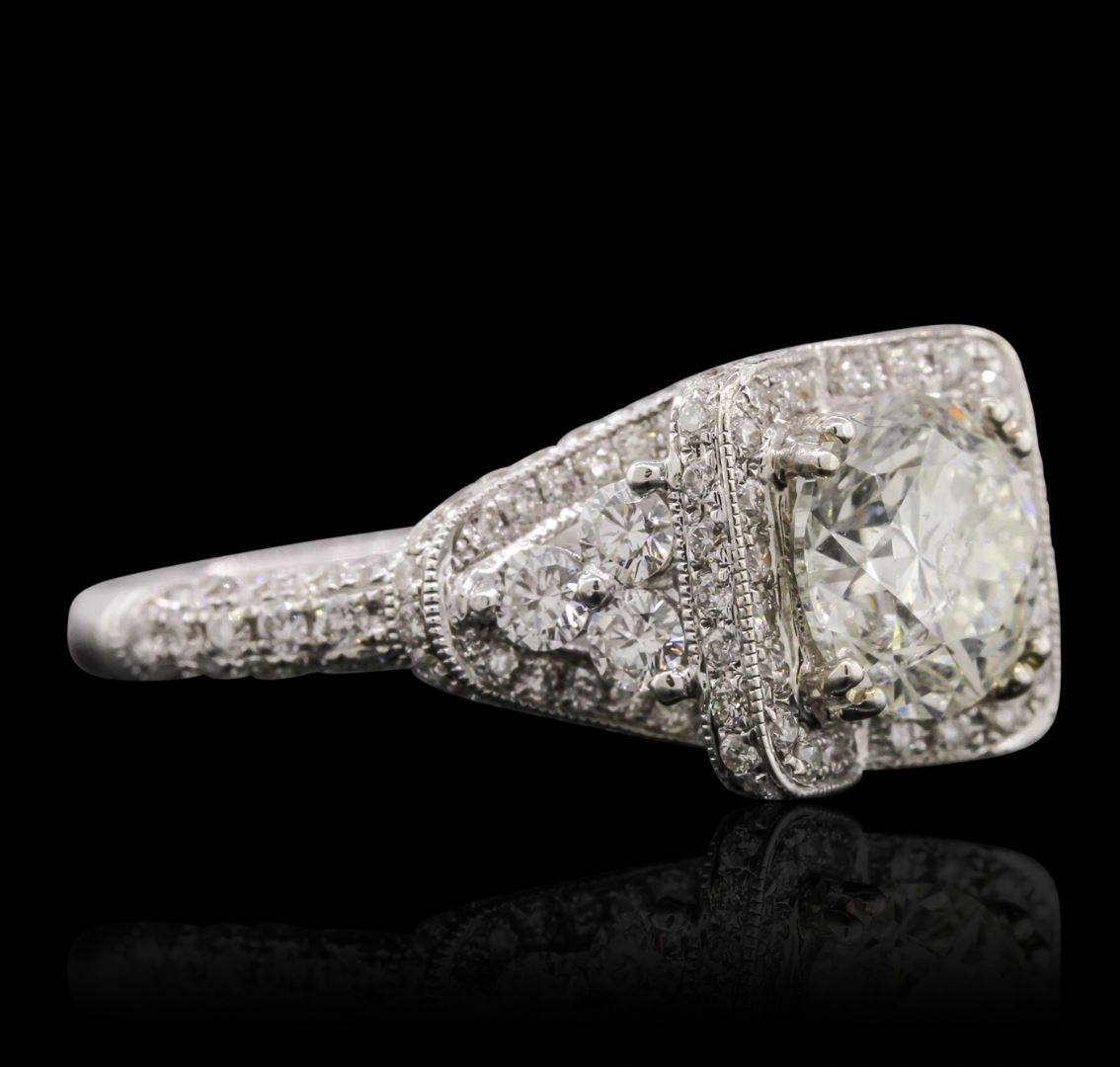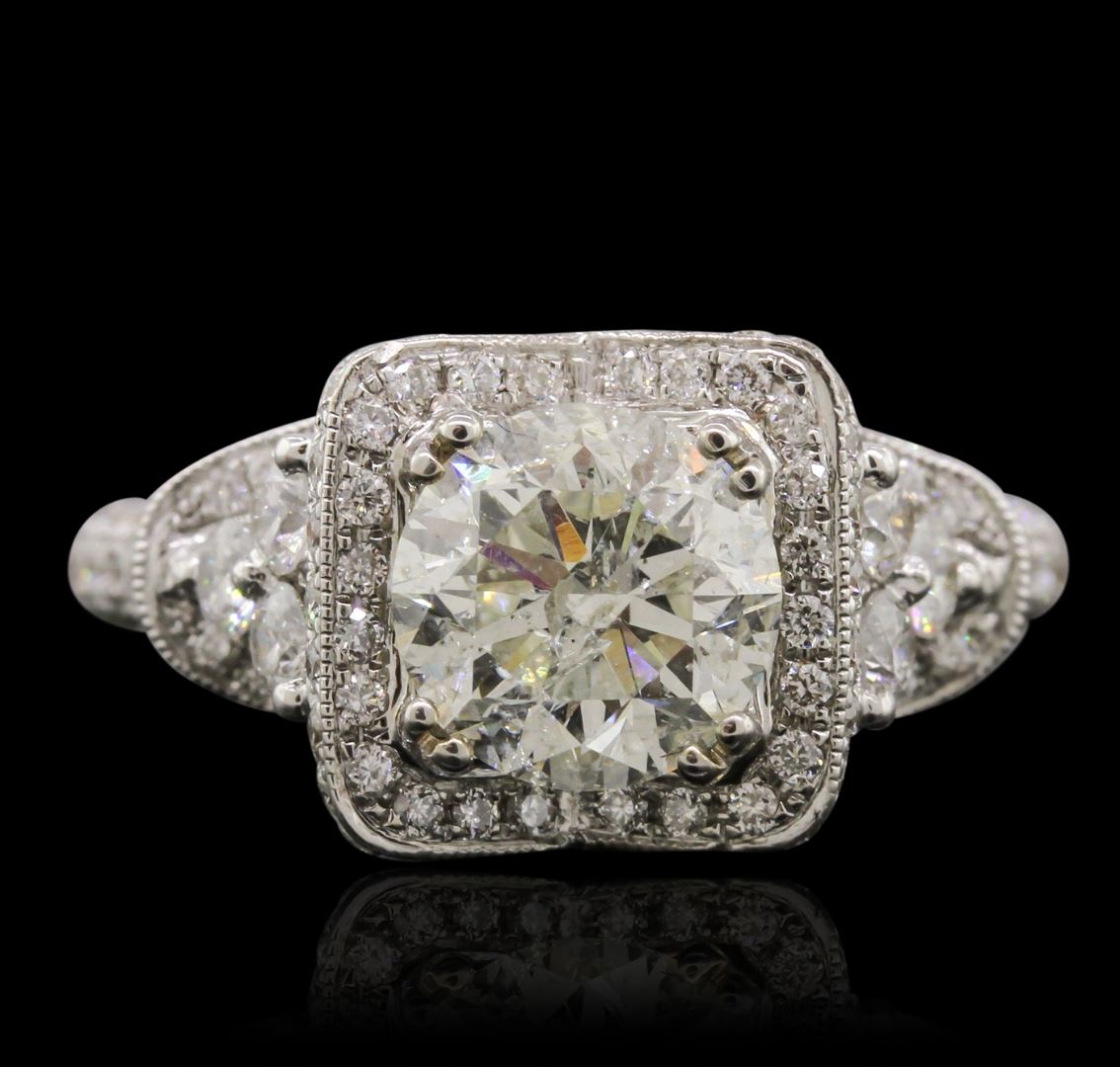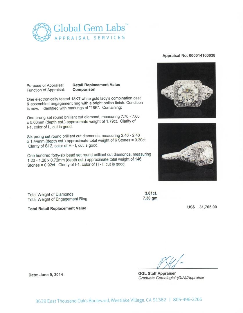 One electronically tested 18KT white gold Ladies combination cast & assembled engagement ring with a bright polish finish. Condition is new. Identified with markings of "18K". Containing: One prong set round brilliant cut diamond, measuring 7.70 - 7.60 x 5.00mm (depth est.) approximate weight of 1.79ct. Clarity: I-1. Color: L, Cut is Good. Six prong set round brilliant cut diamonds, measuring 2.40 - 2.40 x 1.44mm (depth est.) approximate. Total Weight of 6 Stones = 0.30ct. Clarity: SI-2. Color: H - I, Cut is Good. One Hundred Forty-Six bead set round brilliant cut diamonds, measuring 1.20 - 1.20 x 0.72mm (depth est.) approximate. Total Weight of 146 Stones = 0.92ct. Clarity: I-1. Color: H - I, Cut is Good. Total Weight of Diamonds 3.01ct. Total Weight of Engagement Ring 7.30 grams. GGL Appraised at $31,765.00.