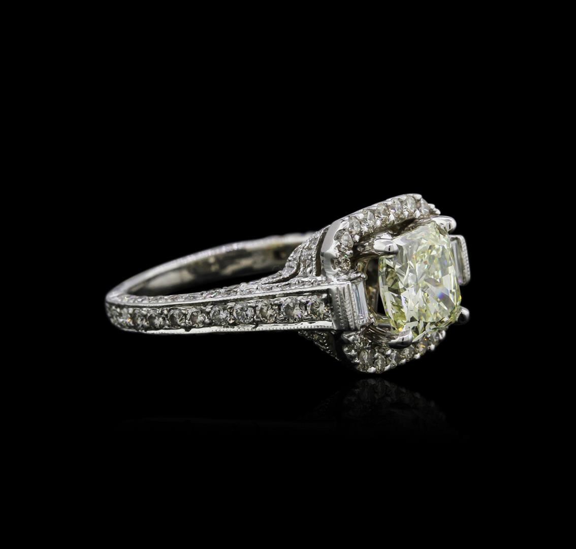One electronically tested 18KT white gold ladies cast diamond engagement ring with a bright polish finish. Condition is new. Containing: One prong set radiant shaped cut diamond, measuring 7.10 x 7.00 x 5.25mm (depth est.) approximate weight of 2.14ct. Clarity: VS-1, color of Fancy Yellow, Cut is Very Good. One Hundred prong set round brilliant cut diamonds, measuring 1.30 - 1.30 x 0.78mm (depth est.) approximate total weight of 100 Stones = 0.80ct. Clarity: SI-2 to I-1. Color: H - I, Cut is Good. Two prong set baguette cut diamonds, measuring 3.00 x 1.50 x 1.28mm (depth est.) approximate total weight of 2 Stones = 0.11ct. Clarity: VS-2. Color: H - I, Cut is Good. All diamonds are graded in the mounting, unless otherwise stated. Total Weight of Diamonds 3.05ct. Total Weight of Engagement Ring 6.30 grams. GGL Appraised at $15,775.00.