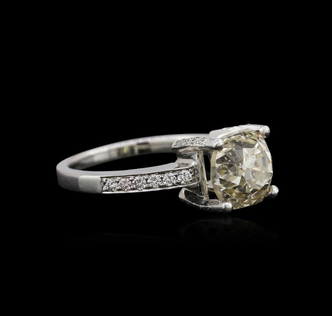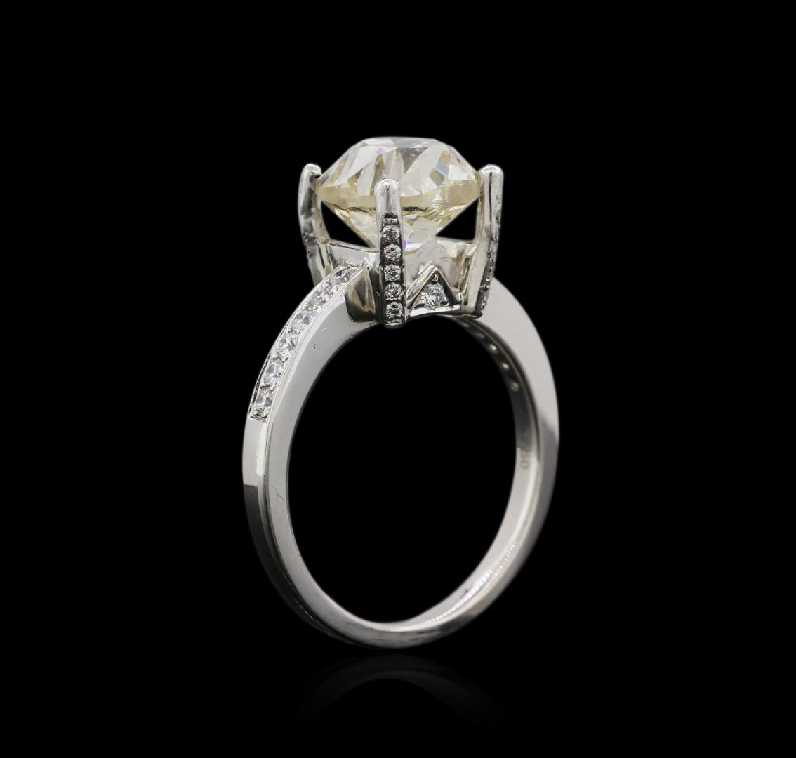 One electronically tested 18KT white gold ladies cast diamond engagement ring with a bright polish finish. Identified with markings of "750". Condition is new. Containing: One prong set old mine cut diamond, measuring 8.40 - 8.20 x 6.80mm (depth est.) stated weight of 2.86ct. Clarity: SI-1. Color: L. Thirty-Four prong set round brilliant cut diamonds, measuring 1.20 - 1.10 x 0.69mm (depth est.) approximate total weight of 34 Stones = 0.19ct. Clarity: SI-2 to I-1. Color: G - H, Cut is Good. Diamonds are graded in the mounting, unless otherwise stated. Total Weight of Diamonds 3.05ct. Total Weight of Engagement Ring 4.90 grams. GGL Appraised at $25,745.00.