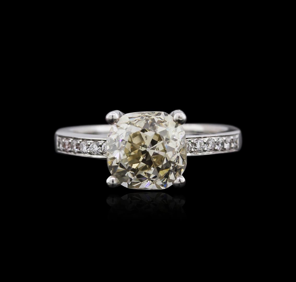 One electronically tested 18KT white gold ladies cast diamond engagement ring with a bright polish finish. Identified with markings of "750". Condition is new. Containing: One prong set old mine cut diamond, measuring 8.40 - 8.20 x 6.80mm (depth est.) stated weight of 2.86ct. Clarity: SI-1. Color: L. Thirty-Four prong set round brilliant cut diamonds, measuring 1.20 - 1.10 x 0.69mm (depth est.) approximate total weight of 34 Stones = 0.19ct. Clarity: SI-2 to I-1. Color: G - H, Cut is Good. Diamonds are graded in the mounting, unless otherwise stated. Total Weight of Diamonds 3.05ct. Total Weight of Engagement Ring 4.90 grams. GGL Appraised at $25,745.00.