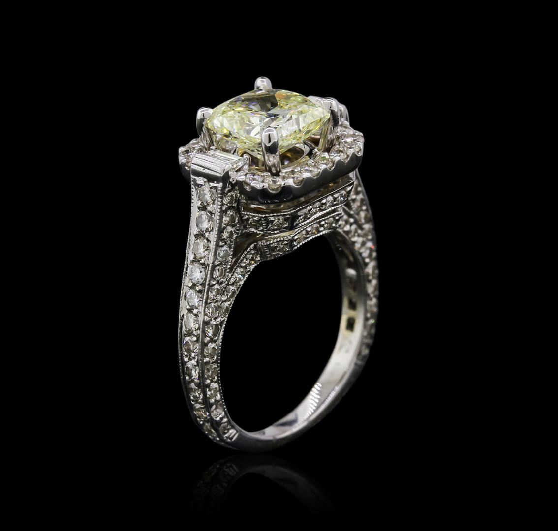 One electronically tested 18KT white gold ladies cast diamond engagement ring with a bright polish finish. Condition is new. Containing: One prong set radiant shaped cut diamond, measuring 7.10 x 7.00 x 5.25mm (depth est.) approximate weight of 2.14ct. Clarity: VS-1, color of Fancy Yellow, Cut is Very Good. One Hundred prong set round brilliant cut diamonds, measuring 1.30 - 1.30 x 0.78mm (depth est.) approximate total weight of 100 Stones = 0.80ct. Clarity: SI-2 to I-1. Color: H - I, Cut is Good. Two prong set baguette cut diamonds, measuring 3.00 x 1.50 x 1.28mm (depth est.) approximate total weight of 2 Stones = 0.11ct. Clarity: VS-2. Color: H - I, Cut is Good. All diamonds are graded in the mounting, unless otherwise stated. Total Weight of Diamonds 3.05ct. Total Weight of Engagement Ring 6.30 grams. GGL Appraised at $15,775.00.