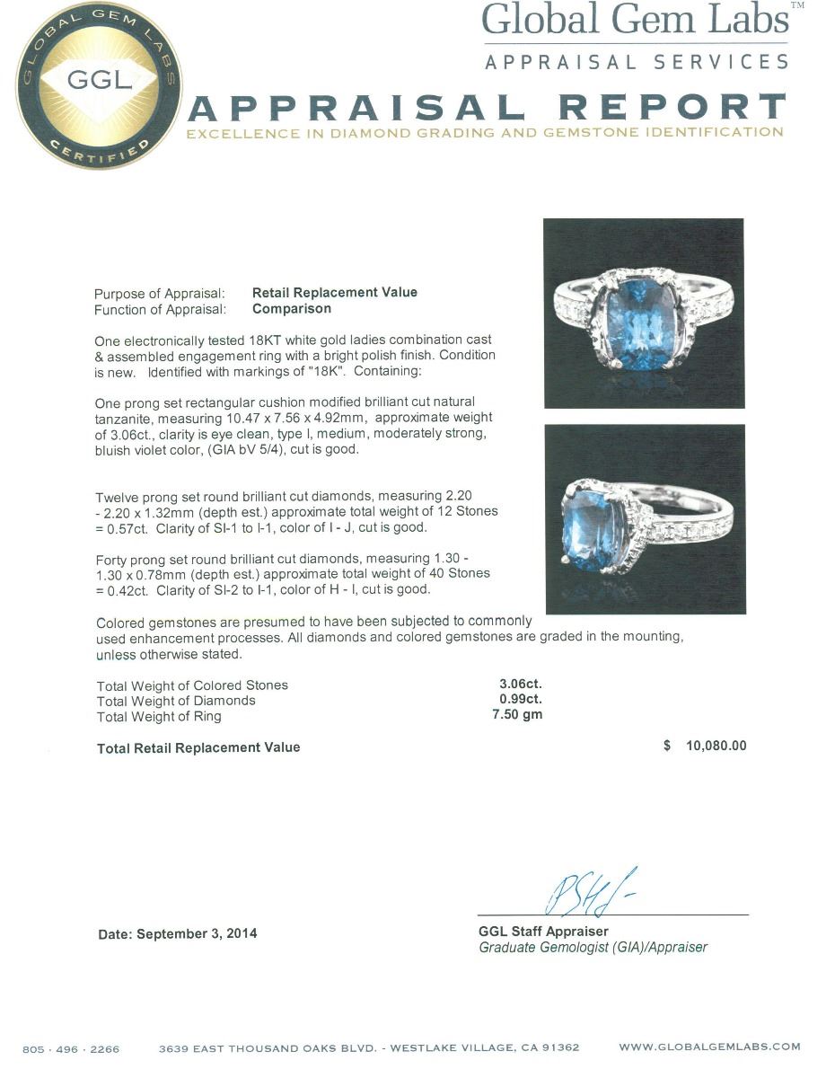 One electronically tested 18KT white gold ladies combination cast & assembled engagement ring with a bright polish finish. Identified with markings of "18K". Condition is new. Containing: One prong set rectangular cushion modified brilliant cut natural tanzanite, measuring 10.47 x 7.56 x 4.92mm, approximate weight of 3.06ct., clarity is eye clean, type I, medium, moderately strong, bluish violet color, (GIA bV 5/4), cut is good. Twelve prong set round brilliant cut diamonds, measuring 2.20 - 2.20 x 1.32mm (depth est.) approximate total weight of 12 Stones = 0.57ct. Clarity: SI-1 to I-1. Color: I - J, Cut is Good. Forty prong set round brilliant cut diamonds, measuring 1.30 - 1.30 x 0.78mm (depth est.) approximate total weight of 40 Stones = 0.42ct. Clarity: SI-2 to I-1. Color: H - I, Cut is Good. Colored gemstones are presumed to have been subjected to commonly used enhancement processes. All diamonds and colored gemstones are graded in the mounting, unless otherwise stated. Total Weight of Colored Stones 3.06ct. Total Weight of Diamonds 0.99ct. Total Weight of Ring 7.50 grams. GGL Appraised at $10,080.00.