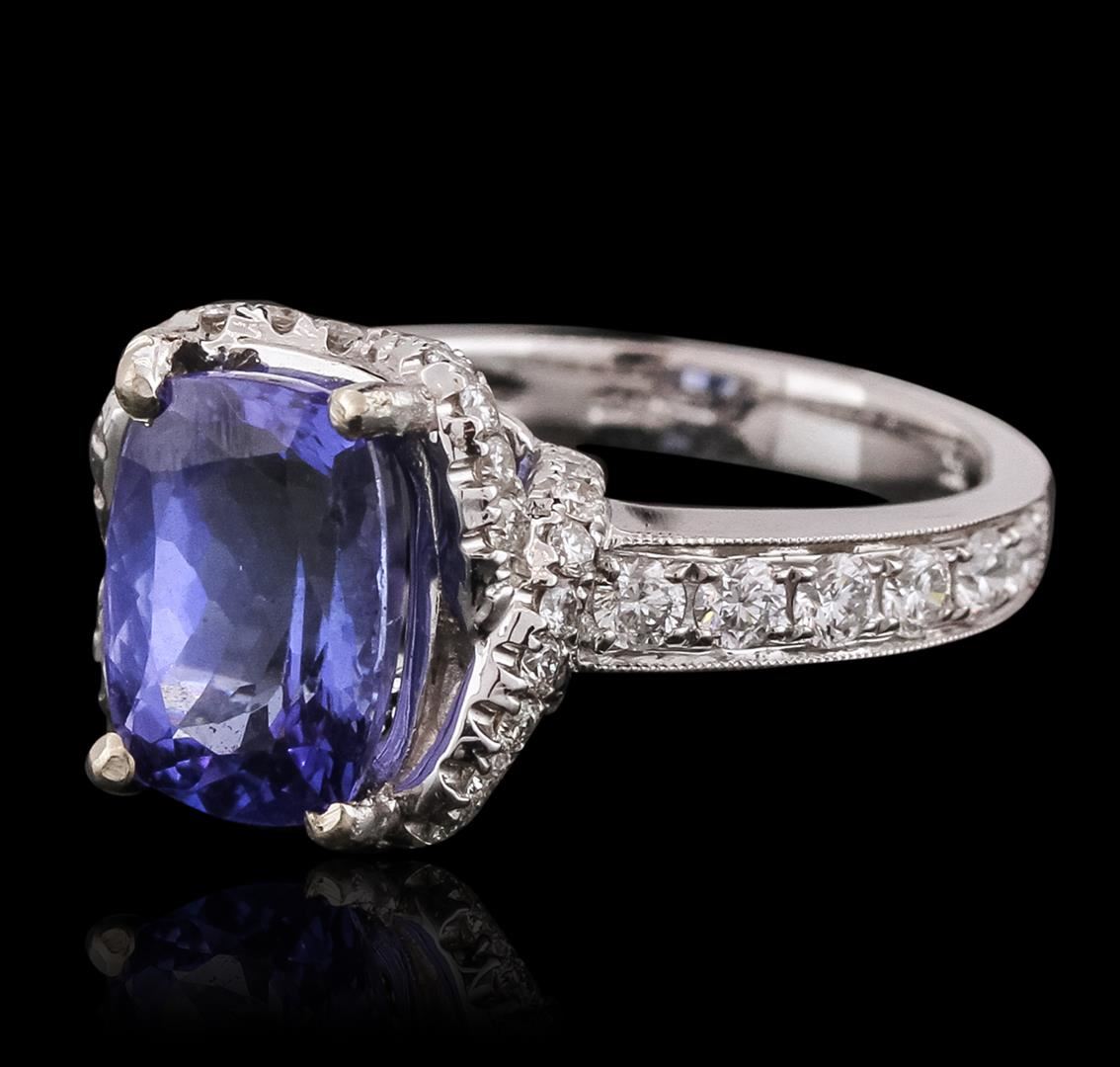 One electronically tested 18KT white gold ladies combination cast & assembled engagement ring with a bright polish finish. Identified with markings of "18K". Condition is new. Containing: One prong set rectangular cushion modified brilliant cut natural tanzanite, measuring 10.47 x 7.56 x 4.92mm, approximate weight of 3.06ct., clarity is eye clean, type I, medium, moderately strong, bluish violet color, (GIA bV 5/4), cut is good. Twelve prong set round brilliant cut diamonds, measuring 2.20 - 2.20 x 1.32mm (depth est.) approximate total weight of 12 Stones = 0.57ct. Clarity: SI-1 to I-1. Color: I - J, Cut is Good. Forty prong set round brilliant cut diamonds, measuring 1.30 - 1.30 x 0.78mm (depth est.) approximate total weight of 40 Stones = 0.42ct. Clarity: SI-2 to I-1. Color: H - I, Cut is Good. Colored gemstones are presumed to have been subjected to commonly used enhancement processes. All diamonds and colored gemstones are graded in the mounting, unless otherwise stated. Total Weight of Colored Stones 3.06ct. Total Weight of Diamonds 0.99ct. Total Weight of Ring 7.50 grams. GGL Appraised at $10,080.00.
