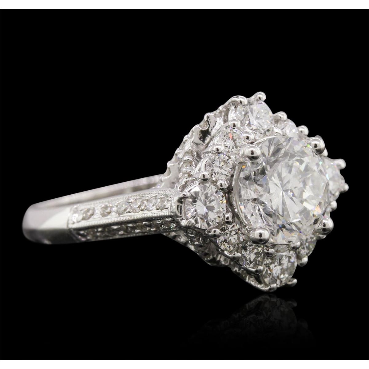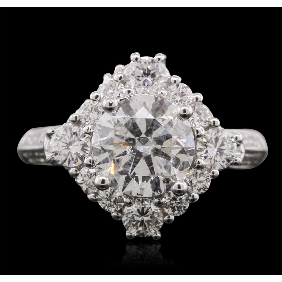 One electronically tested 18KT white gold Ladies combination cast & assembled engagement ring with a bright polish finish. Condition is new. Identified with markings of "18K". Containing: One prong set round brilliant cut diamond, measuring 7.90 - 7.90 x 5.30mm (depth est.) approximate weight of 2.02ct. Clarity: I-1. Color: H, Cut is Good. Four prong set round brilliant cut diamonds, measuring 3.20 - 3.20 x 1.92mm (depth est.) approximate. Total Weight of 4 Stones = 0.48ct. Clarity: SI-1 to SI-2. Color: H - I, Cut is Good. Eight prong set round brilliant cut diamonds, measuring 2.00 - 2.00 x 1.20mm (depth est.) approximate. Total Weight of 8 Stones = 0.23ct. Clarity: SI-2. Color: I, Cut is Good. Seventy-Four bead set round brilliant cut diamonds, measuring 1.10 - 1.10 x 0.66mm (depth est.) approximate. Total Weight of 74 Stones = 0.36ct. Clarity: I-1. Color: H - I, Cut is Good. Total Weight of Diamonds 3.09ct. Total Weight of Engagement Ring 8.00 grams. GGL Appraised at $40,030.00.