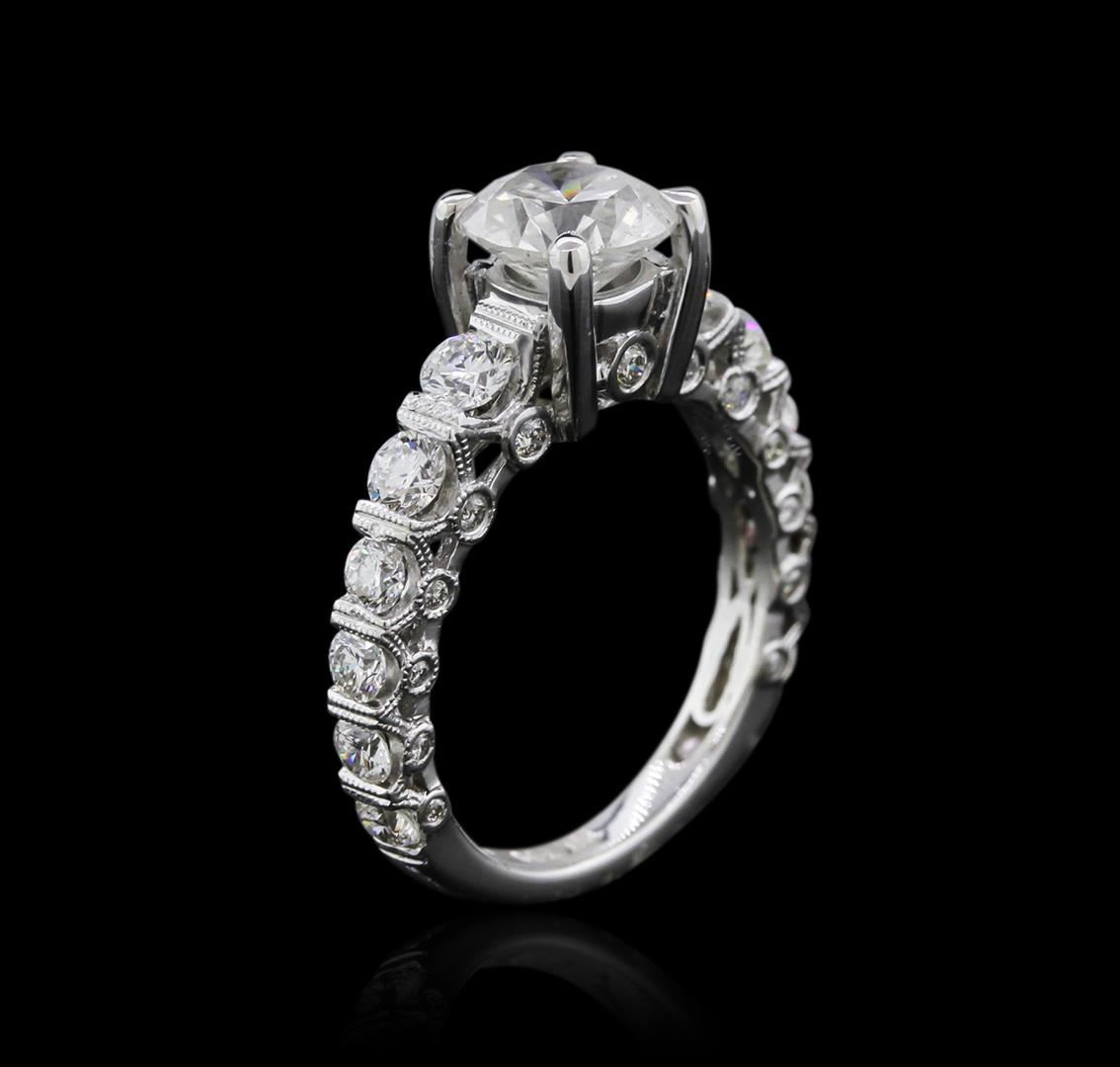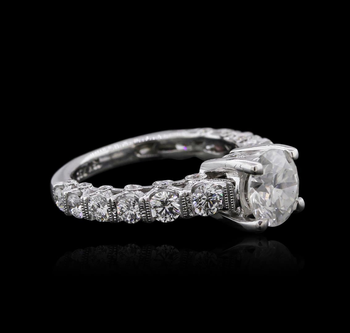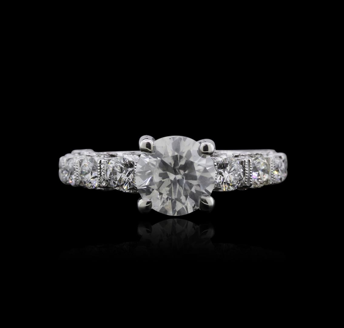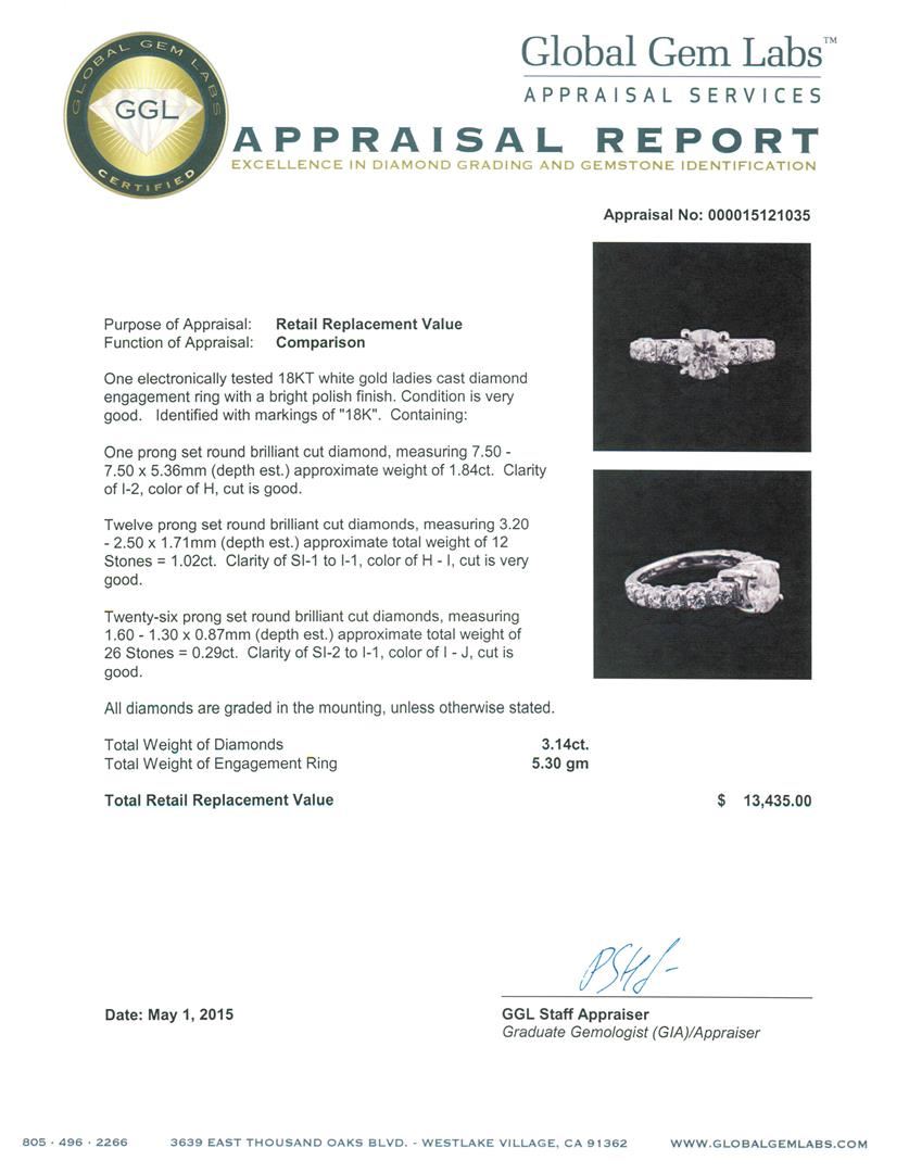 One electronically tested 18KT white gold ladies cast diamond engagement ring with a bright polish finish. Identified with markings of "18K". Condition is very good. Containing: One prong set round brilliant cut diamond, measuring 7.50 - 7.50 x 5.36mm (depth est.) approximate weight of 1.84ct. Clarity: I-2. Color: H, Cut is Good. Twelve prong set round brilliant cut diamonds, measuring 3.20 - 2.50 x 1.71mm (depth est.) approximate. Total Weight of 12 Stones = 1.02ct. Clarity: SI-1 to I-1. Color: H - I, Cut is Very Good. Twenty-Six prong set round brilliant cut diamonds, measuring 1.60 - 1.30 x 0.87mm (depth est.) approximate. Total Weight of 26 Stones = 0.29ct. Clarity: SI-2 to I-1. Color: I - J, Cut is Good. All diamonds are graded in the mounting, unless otherwise stated. Total Weight of Diamonds 3.14ct. Total Weight of Engagement Ring 5.30 grams. GGL Appraised at $13,435.00.