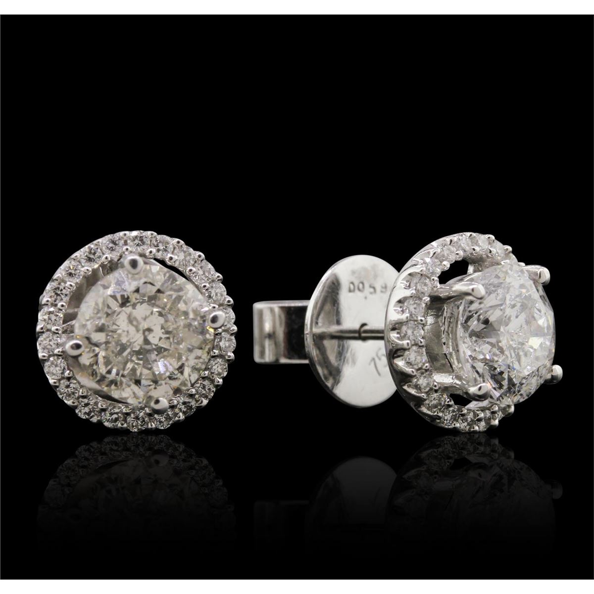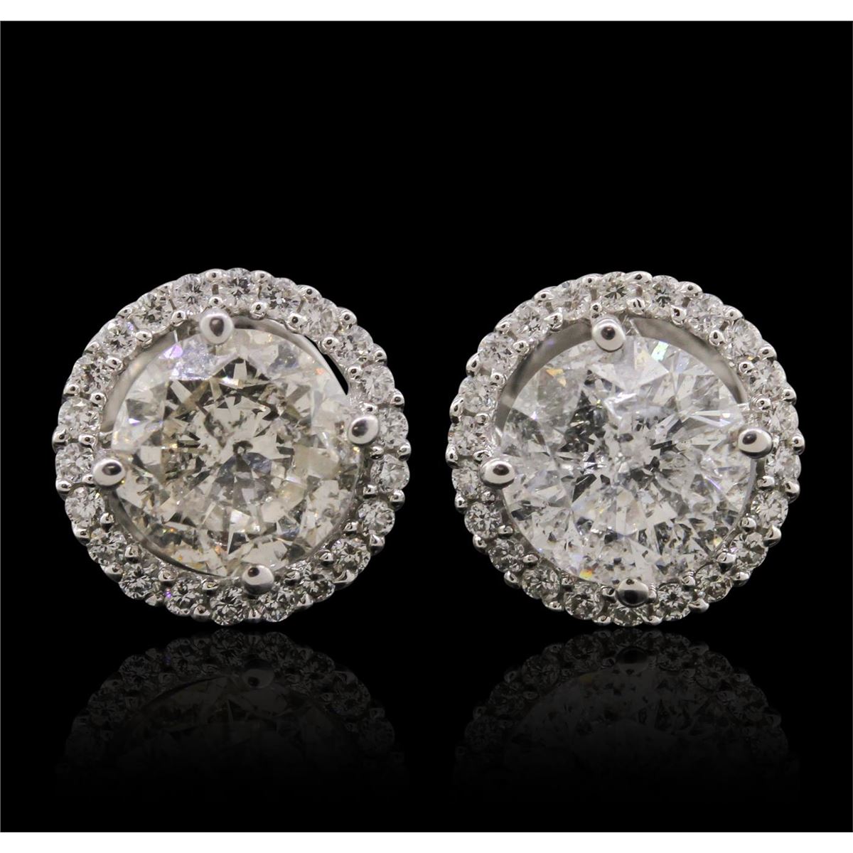 One pair electronically tested 18KT white gold Ladies cast stud earrings with friction posts with a bright polish finish. Condition is new. Identified with markings of "750". Containing: One prong set round brilliant cut diamond, measuring 7.00 - 7.00 x 4.50mm (depth est.) approximate weight of 1.35ct. Clarity: I-2. Color: J, Cut is Good. One prong set round brilliant cut diamond, measuring 7.15 - 7.15 x 4.61mm (depth est.) approximate weight of 1.44ct. Clarity: I-2. Color: I, Cut is Good. Forty-Four prong set round brilliant cut diamonds, measuring 1.30 - 1.30 x 0.78mm (depth est.) approximate. Total Weight of 44 Stones = 0.35ct. Clarity: SI-2 to I-1. Color: I - J, Cut is Good. Total Weight of Diamonds 3.14ct. Total Weight of Earrings 5.30 grams. GGL Appraised at $22,895.00.