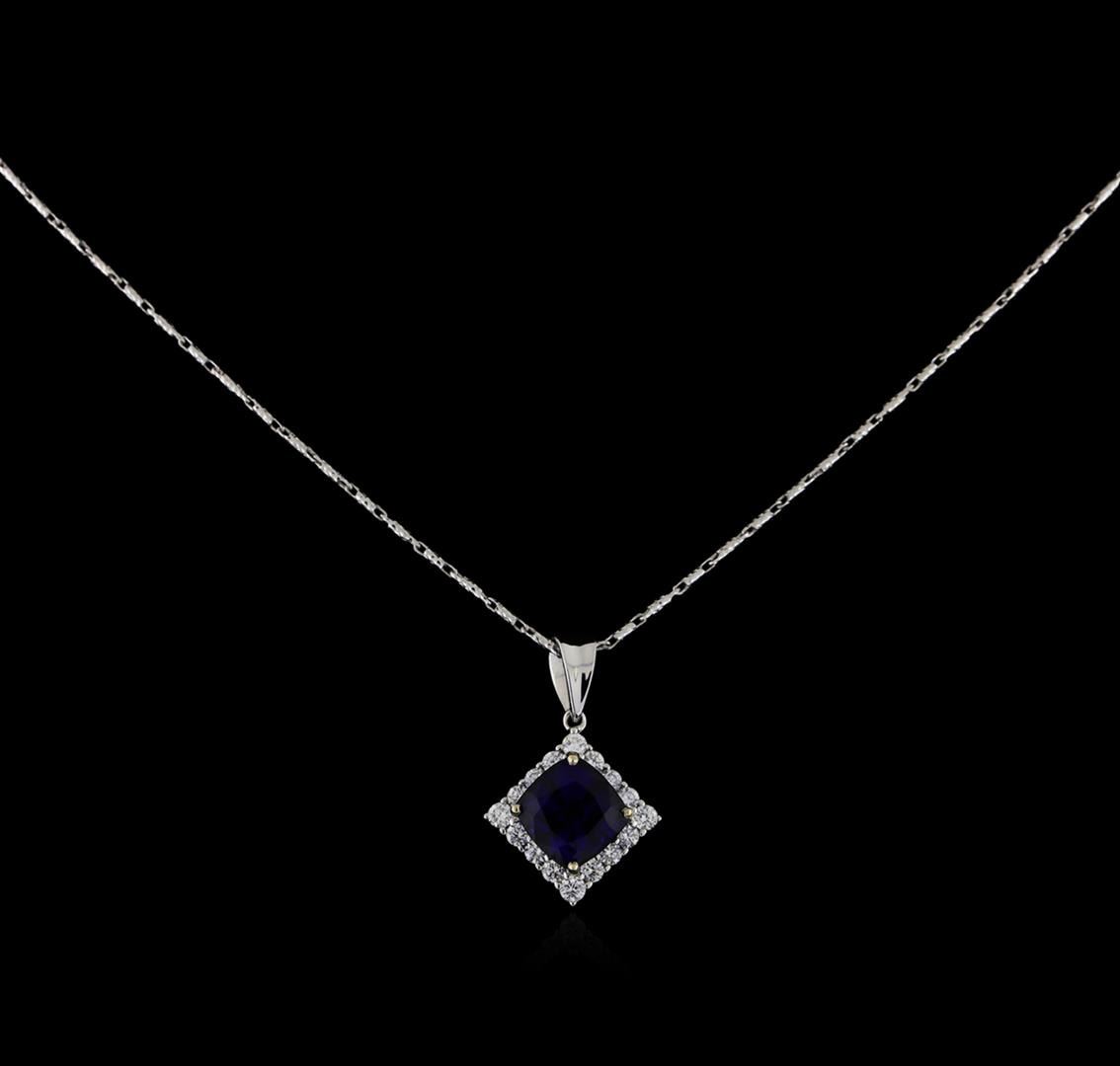 One electronically tested 18KT White Gold ladies cast & assembled sapphire and diamond pendant with chain. The pendant features a sapphire set within a diamond bezel, completed by a White Gold bail. The pendant is supported by an eighteen inch length 14KT White Gold designer style chain, terminating in a lobster claw clasp. Bright polish finish. Identified with markings of "18K 750". Condition is new, good workmanship. Containing: One prong set square cushion brilliant cut blue sapphire, measuring 7.70 x 7.60 x 5.45mm, 6% bulge factor, approximate weight of 3.18ct., clarity is eye clean, type II, dark, moderately strong, blue color, (GIA B 7/4), cut is good. Transmitting light with no distortion, transparent. Indications of laboratory high temperature diffusion treatment. Whether or not this gemstone is natural cannot currently be determined due to diffusion treatment. Graded in the setting. Sixteen prong set round brilliant cut diamonds, measuring 1.90 - 1.80 x 1.11mm (depth est.) approximate total weight of 16 Stones = 0.47ct. Graded in the setting. Clarity: VS-1 to SI-1. Color: F - H. Total Weight of Colored Stones 3.18ct. Total Weight of Diamonds 0.47ct. Total Weight of Pendant With Chain 4.95 grams. AIG Appraised.