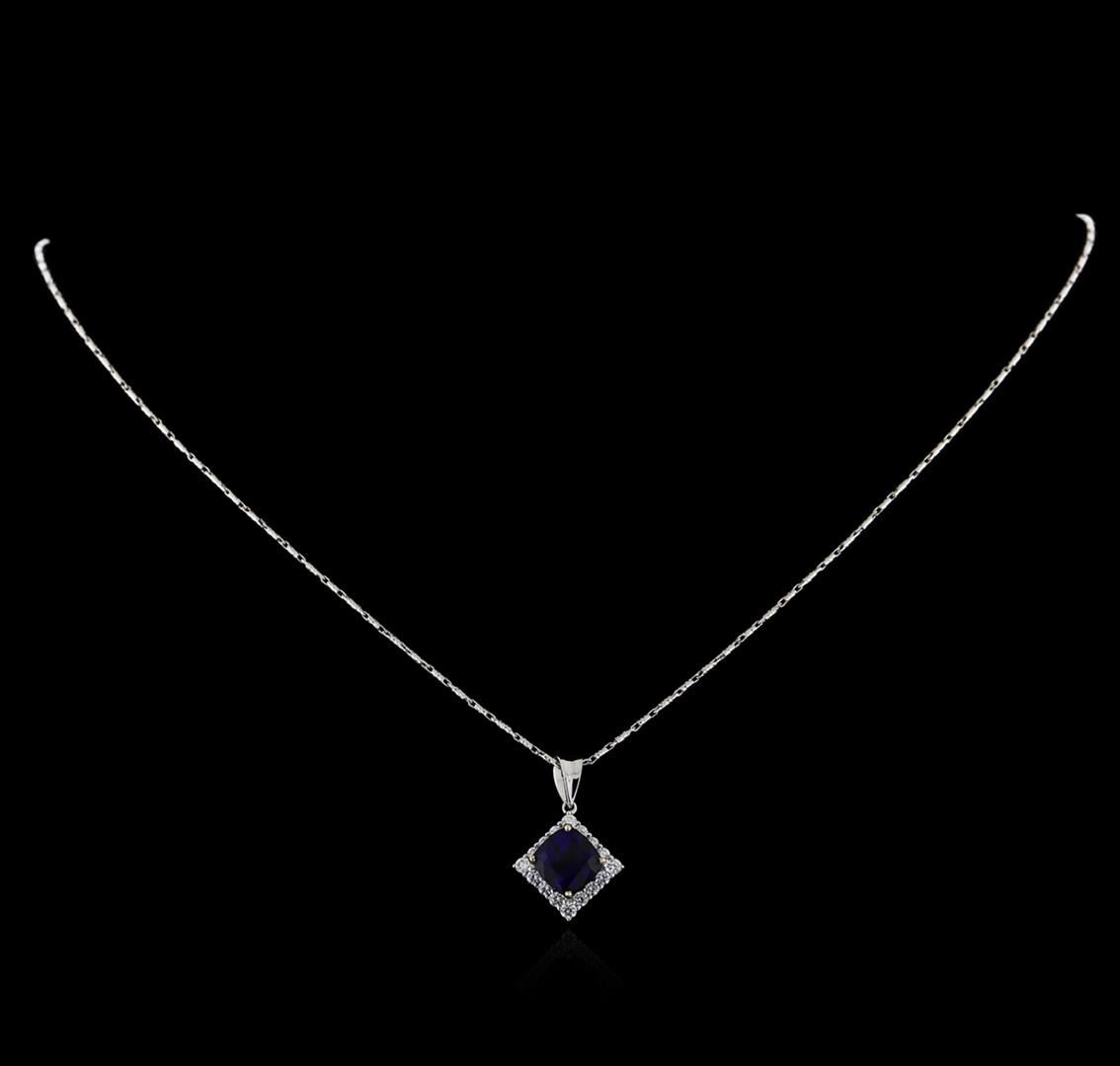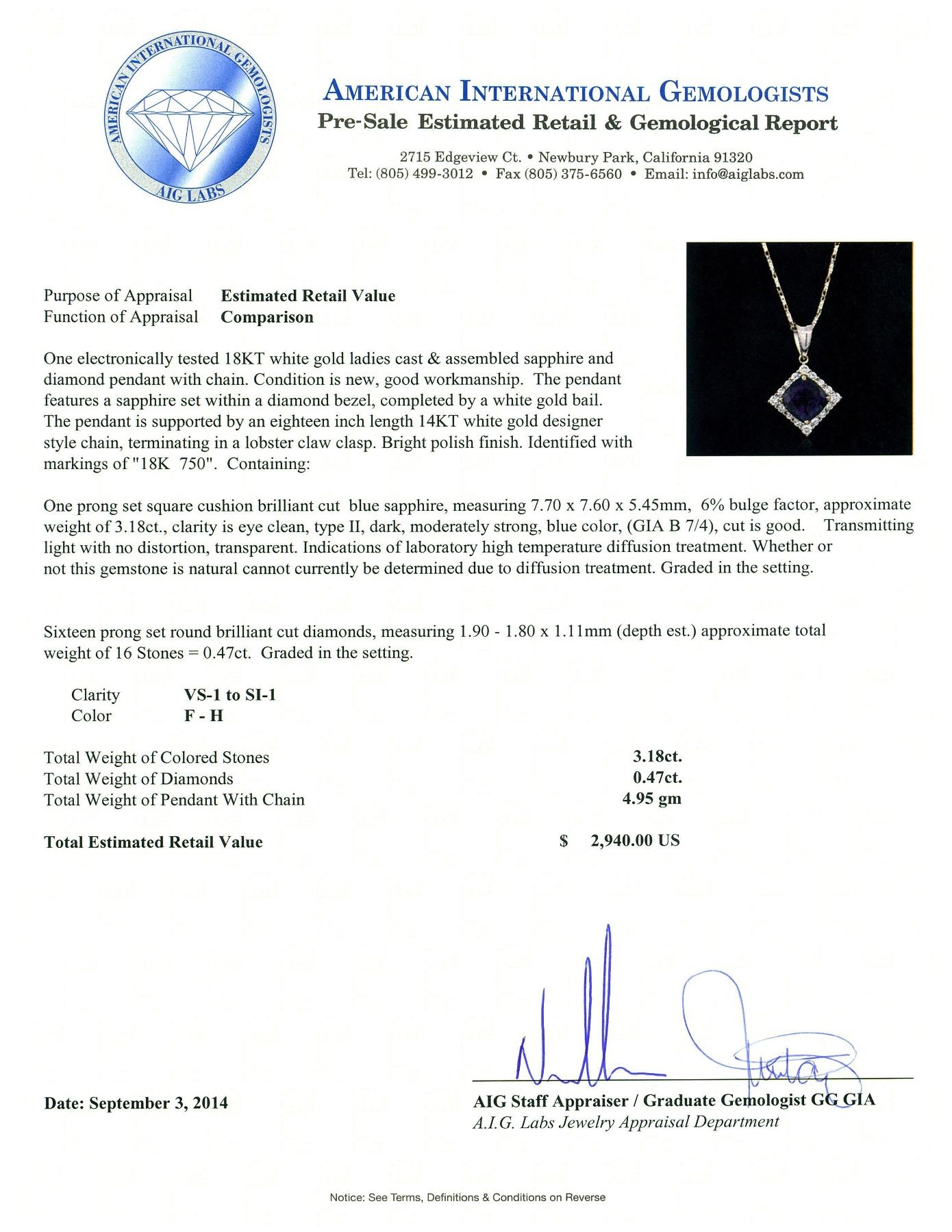 One electronically tested 18KT White Gold ladies cast & assembled sapphire and diamond pendant with chain. The pendant features a sapphire set within a diamond bezel, completed by a White Gold bail. The pendant is supported by an eighteen inch length 14KT White Gold designer style chain, terminating in a lobster claw clasp. Bright polish finish. Identified with markings of "18K 750". Condition is new, good workmanship. Containing: One prong set square cushion brilliant cut blue sapphire, measuring 7.70 x 7.60 x 5.45mm, 6% bulge factor, approximate weight of 3.18ct., clarity is eye clean, type II, dark, moderately strong, blue color, (GIA B 7/4), cut is good. Transmitting light with no distortion, transparent. Indications of laboratory high temperature diffusion treatment. Whether or not this gemstone is natural cannot currently be determined due to diffusion treatment. Graded in the setting. Sixteen prong set round brilliant cut diamonds, measuring 1.90 - 1.80 x 1.11mm (depth est.) approximate total weight of 16 Stones = 0.47ct. Graded in the setting. Clarity: VS-1 to SI-1. Color: F - H. Total Weight of Colored Stones 3.18ct. Total Weight of Diamonds 0.47ct. Total Weight of Pendant With Chain 4.95 grams. AIG Appraised.