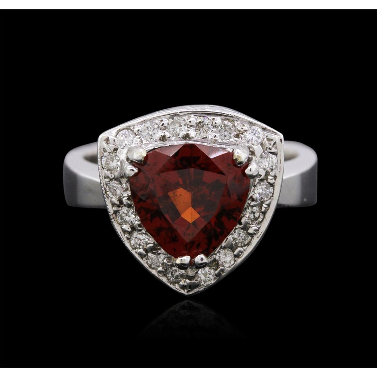 One electronically tested 18KT white gold ladies combination cast & assembled garnet and diamond ring with a flat shank with a bright polish finish. Identified with markings of "18K". Condition is new. Containing: One prong set triangle modified brilliant cut natural pyrope garnet, measuring 9.00 x 9.00 x 5.85mm, approximate weight of 3.18ct., clarity is eye clean, type II, dark, very slightly brownish, brownish red color, (GIA slpR 7/3), cut is very good. Eighteen prong set round brilliant cut diamonds, measuring 1.50 - 1.50 x 0.90mm (depth est.) approximate total weight of 18 Stones = 0.22ct. Clarity: SI-2 to I-1. Color: I - J, Cut is Good. All diamonds and colored gemstones are graded in the mounting, unless otherwise stated. Colored gemstones are presumed to have been subjected to commonly used enhancement processes. Total Weight of Colored Stones 3.18ct. Total Weight of Diamonds 0.22ct. Total Weight of Ring 11.20 grams. GGL Appraised at $6,000.00.