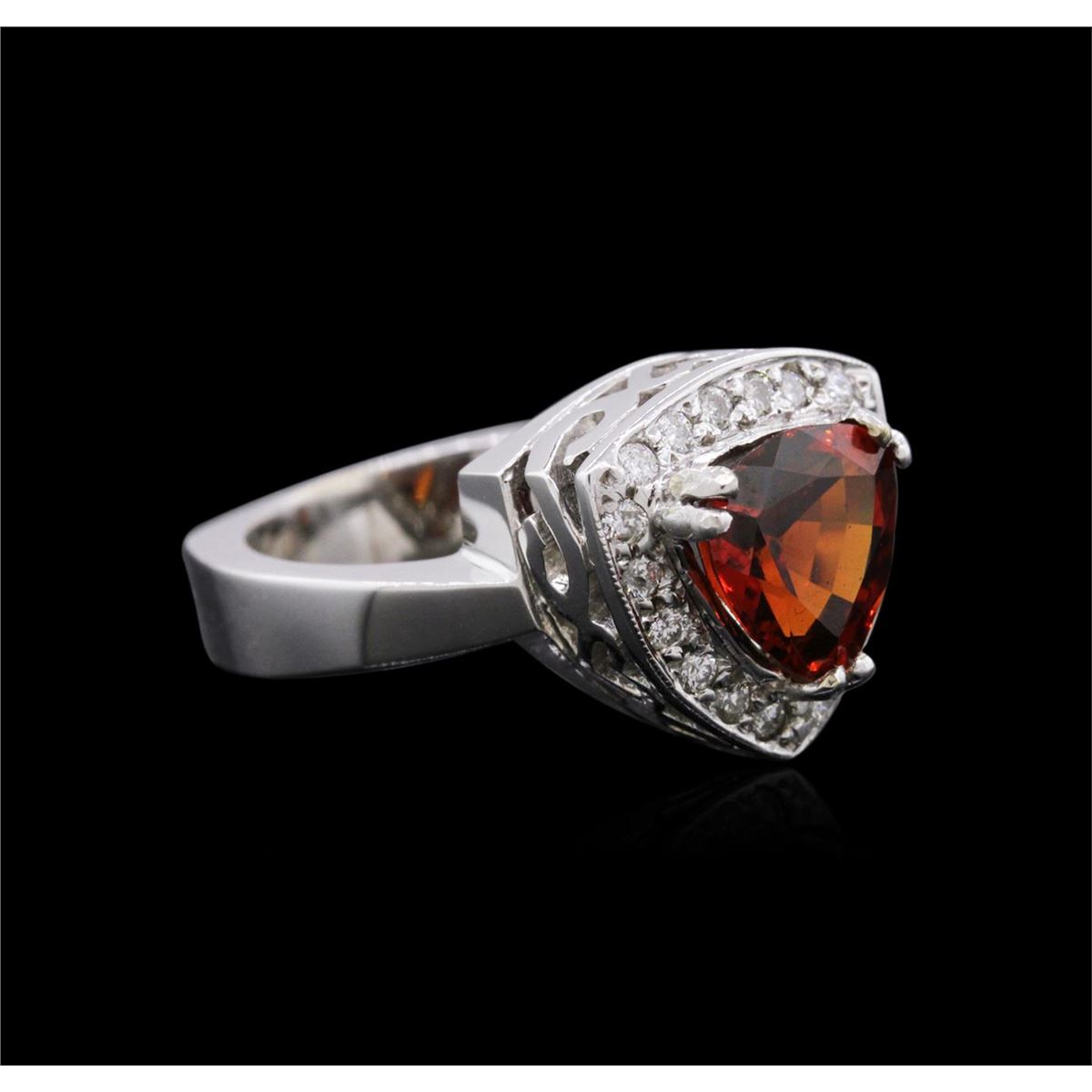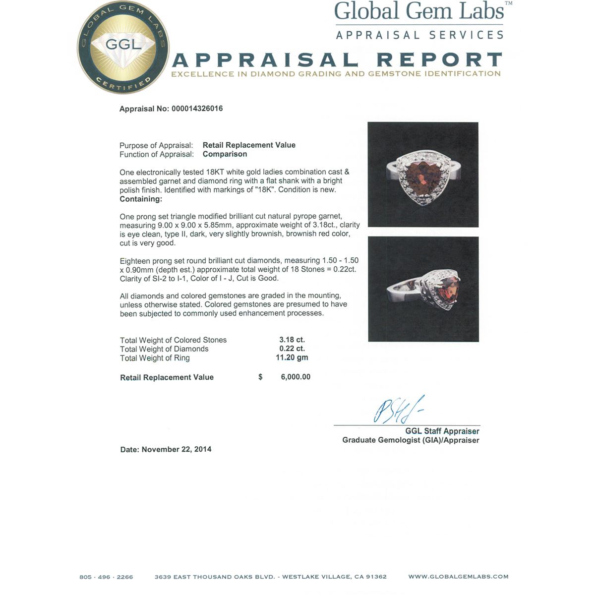 One electronically tested 18KT white gold ladies combination cast & assembled garnet and diamond ring with a flat shank with a bright polish finish. Identified with markings of "18K". Condition is new. Containing: One prong set triangle modified brilliant cut natural pyrope garnet, measuring 9.00 x 9.00 x 5.85mm, approximate weight of 3.18ct., clarity is eye clean, type II, dark, very slightly brownish, brownish red color, (GIA slpR 7/3), cut is very good. Eighteen prong set round brilliant cut diamonds, measuring 1.50 - 1.50 x 0.90mm (depth est.) approximate total weight of 18 Stones = 0.22ct. Clarity: SI-2 to I-1. Color: I - J, Cut is Good. All diamonds and colored gemstones are graded in the mounting, unless otherwise stated. Colored gemstones are presumed to have been subjected to commonly used enhancement processes. Total Weight of Colored Stones 3.18ct. Total Weight of Diamonds 0.22ct. Total Weight of Ring 11.20 grams. GGL Appraised at $6,000.00.