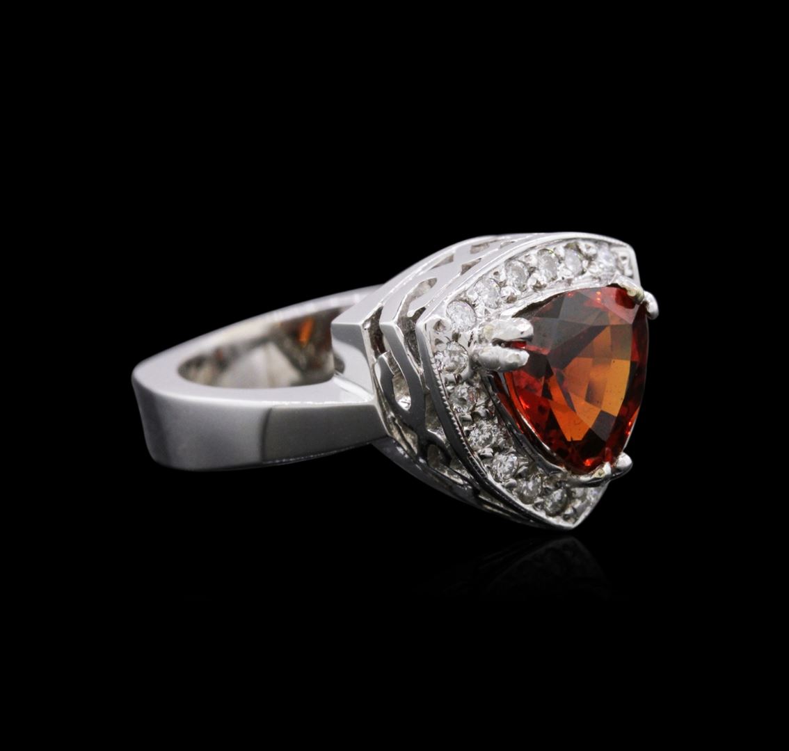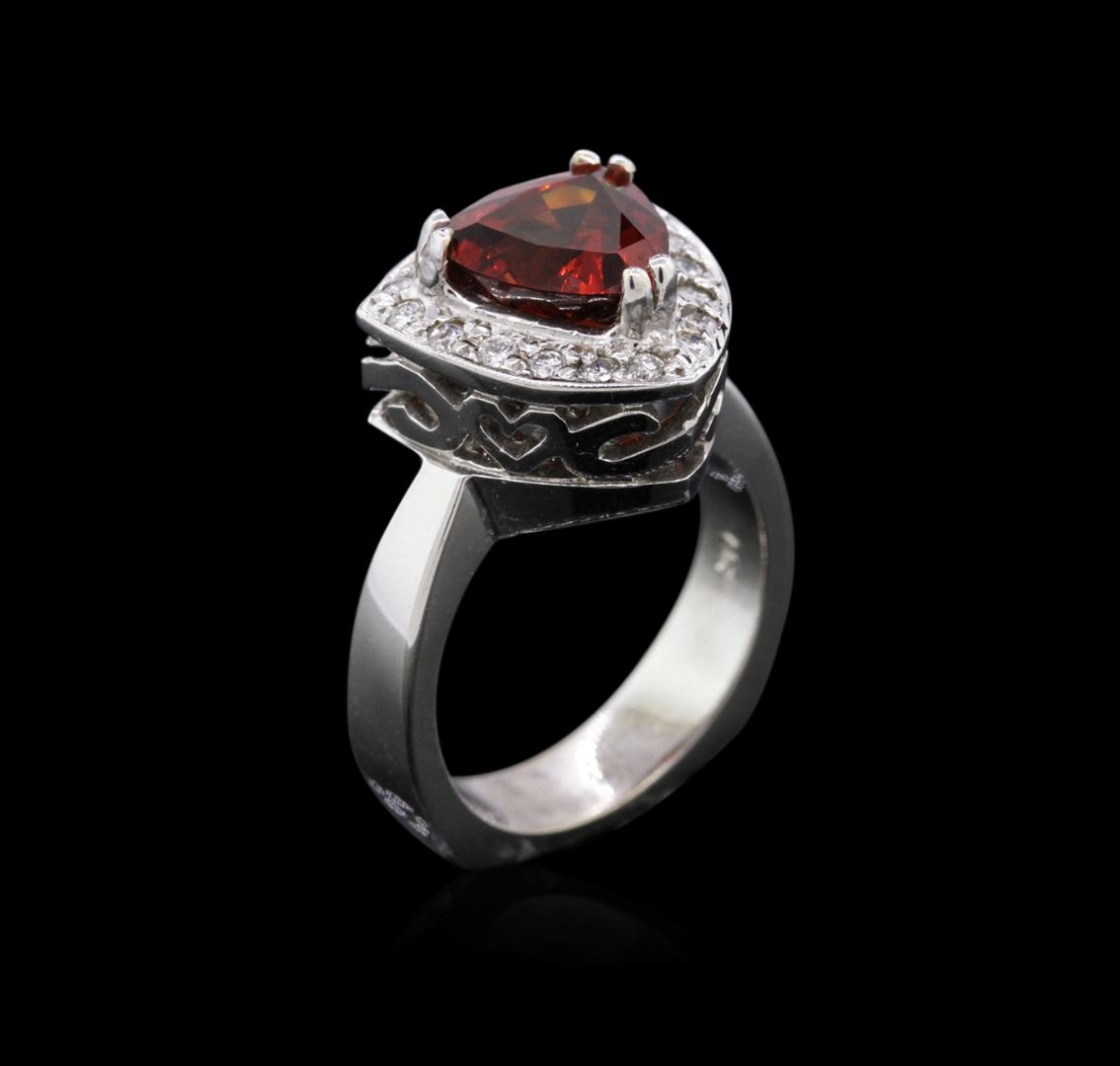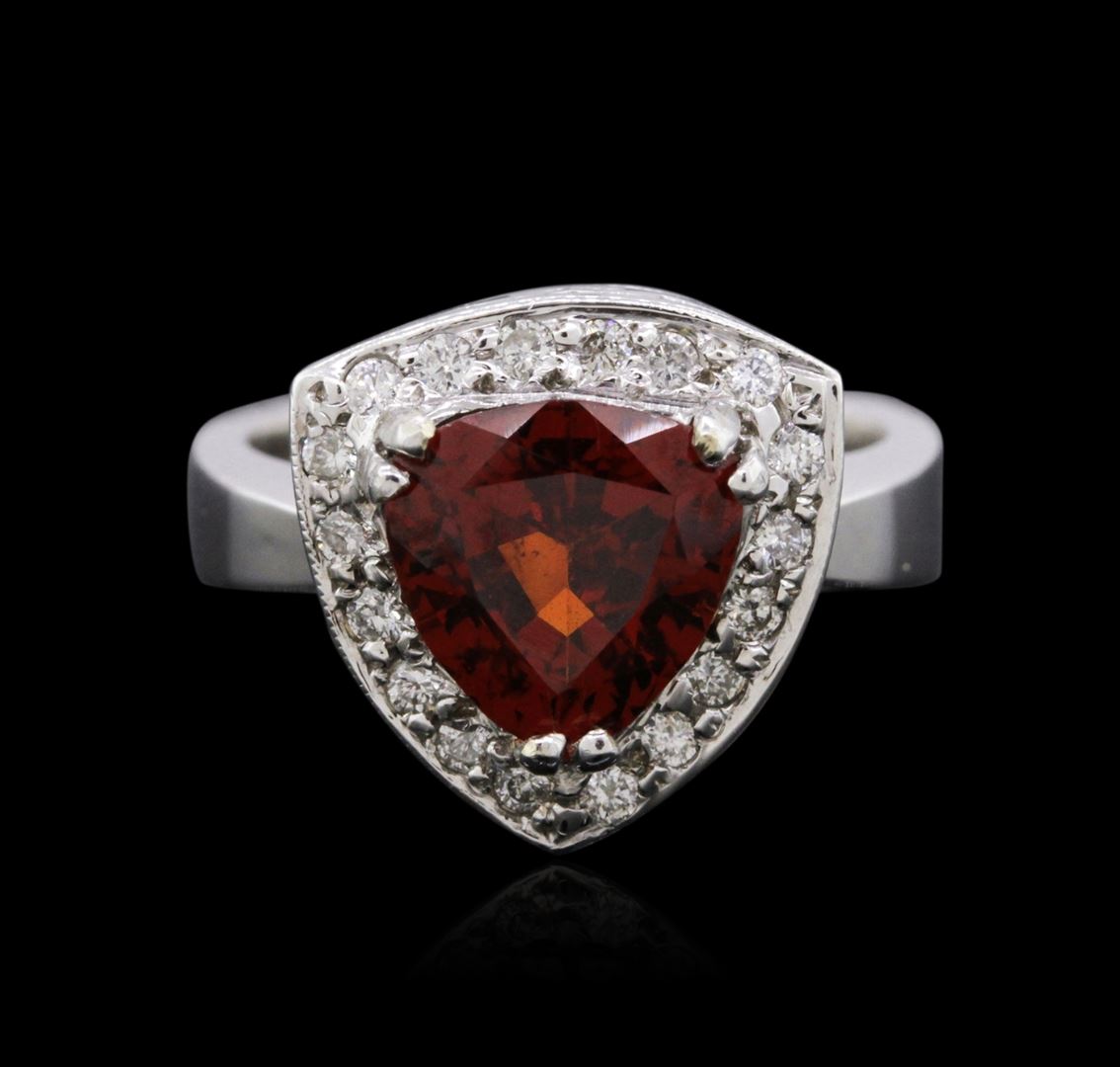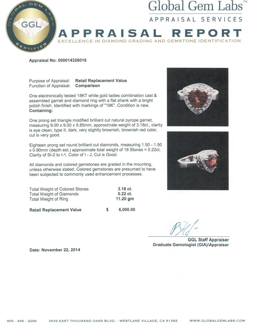 One electronically tested 18KT white gold ladies combination cast & assembled garnet and diamond ring with a flat shank with a bright polish finish. Identified with markings of "18K". Condition is new. Containing: One prong set triangle modified brilliant cut natural pyrope garnet, measuring 9.00 x 9.00 x 5.85mm, approximate weight of 3.18ct., clarity is eye clean, type II, dark, very slightly brownish, brownish red color, (GIA slpR 7/3), cut is very good. Eighteen prong set round brilliant cut diamonds, measuring 1.50 - 1.50 x 0.90mm (depth est.) approximate total weight of 18 Stones = 0.22ct. Clarity: SI-2 to I-1. Color: I - J, Cut is Good. All diamonds and colored gemstones are graded in the mounting, unless otherwise stated. Colored gemstones are presumed to have been subjected to commonly used enhancement processes. Total Weight of Colored Stones 3.18ct. Total Weight of Diamonds 0.22ct. Total Weight of Ring 11.20 grams. GGL Appraised at $6,000.00.
