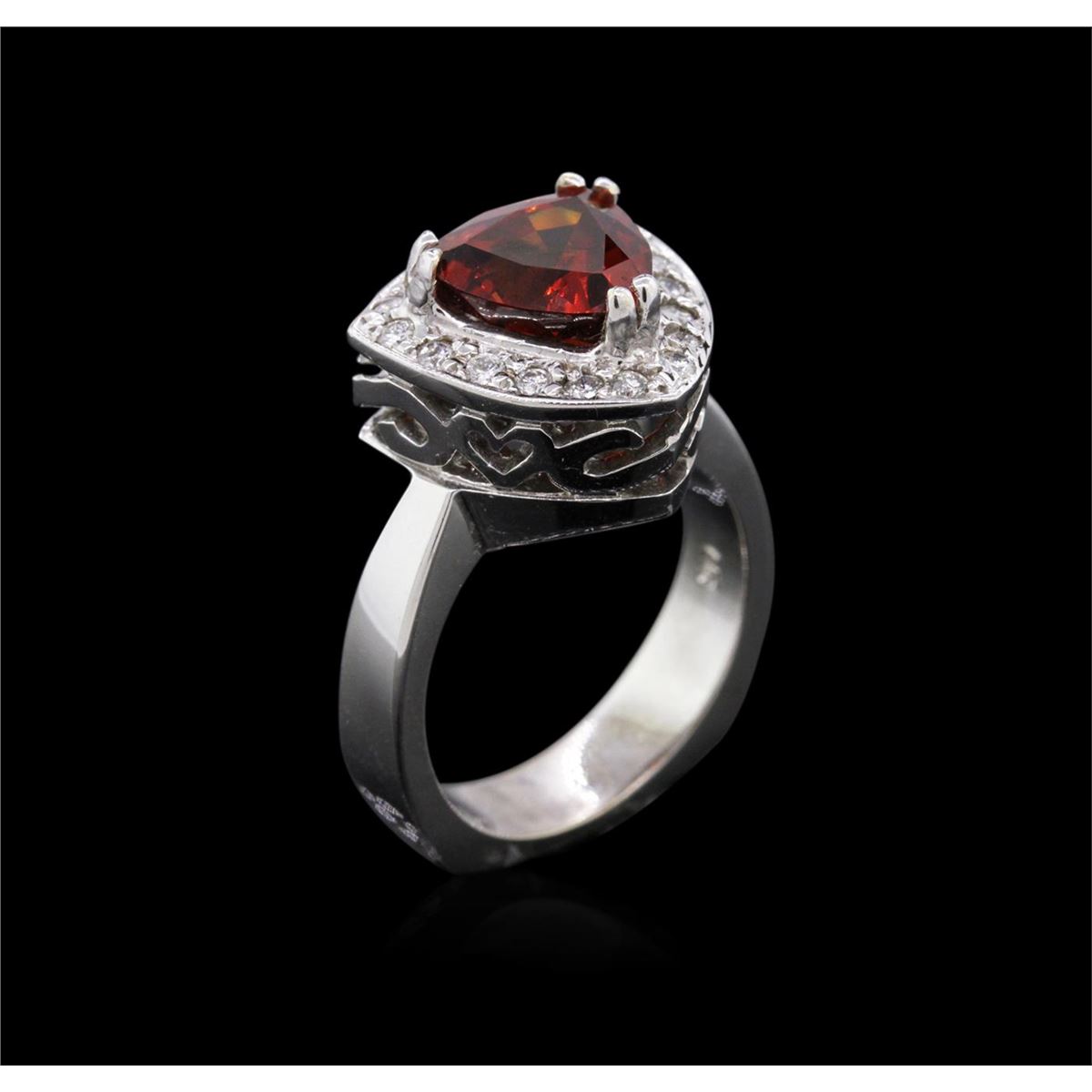 One electronically tested 18KT white gold ladies combination cast & assembled garnet and diamond ring with a flat shank with a bright polish finish. Identified with markings of "18K". Condition is new. Containing: One prong set triangle modified brilliant cut natural pyrope garnet, measuring 9.00 x 9.00 x 5.85mm, approximate weight of 3.18ct., clarity is eye clean, type II, dark, very slightly brownish, brownish red color, (GIA slpR 7/3), cut is very good. Eighteen prong set round brilliant cut diamonds, measuring 1.50 - 1.50 x 0.90mm (depth est.) approximate total weight of 18 Stones = 0.22ct. Clarity: SI-2 to I-1. Color: I - J, Cut is Good. All diamonds and colored gemstones are graded in the mounting, unless otherwise stated. Colored gemstones are presumed to have been subjected to commonly used enhancement processes. Total Weight of Colored Stones 3.18ct. Total Weight of Diamonds 0.22ct. Total Weight of Ring 11.20 grams. GGL Appraised at $6,000.00.
