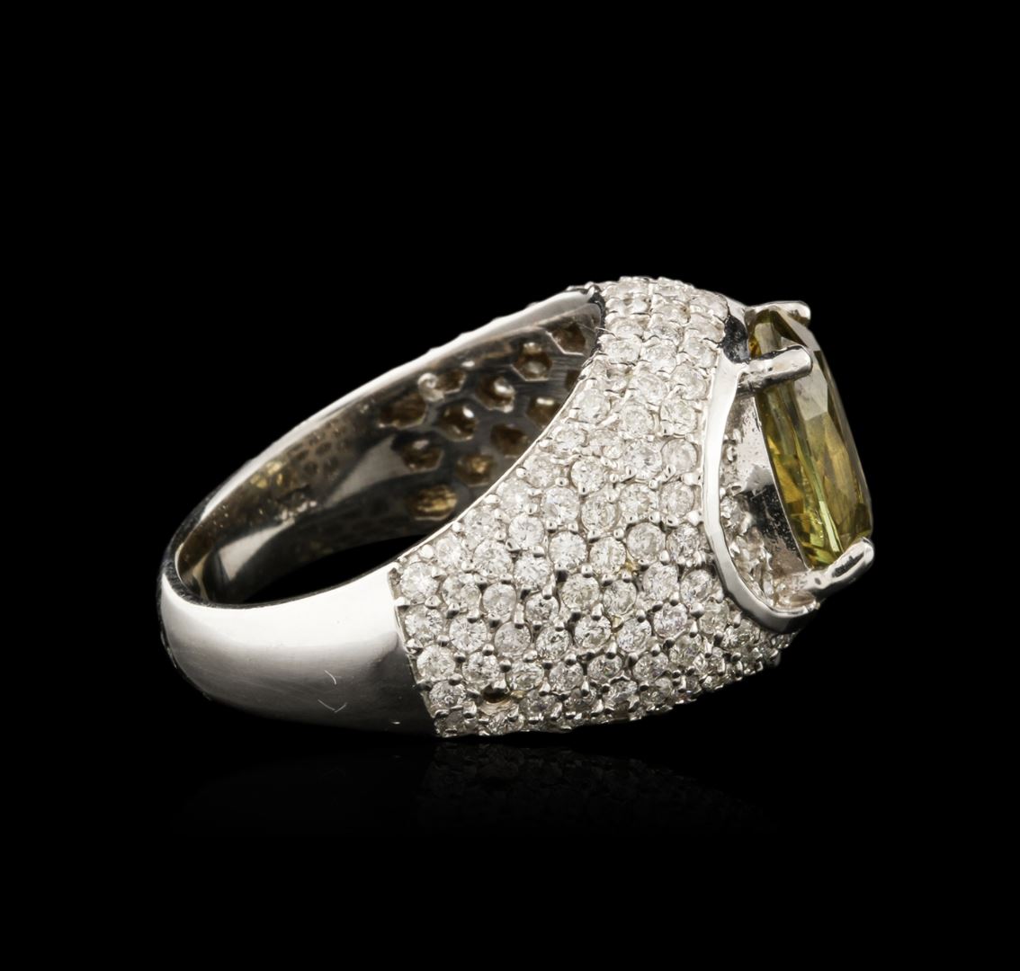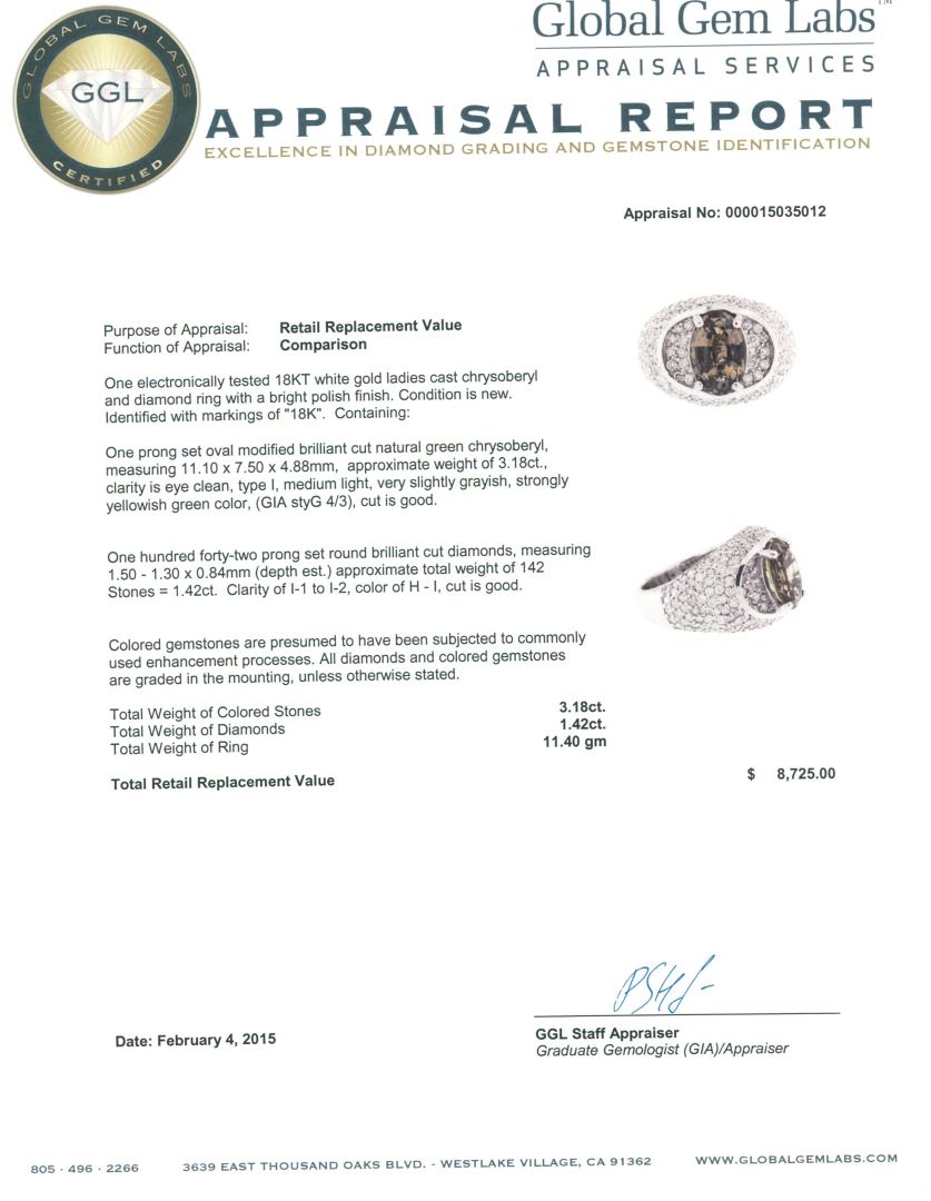 One electronically tested 18KT white gold ladies cast chrysoberyl and diamond ring with a bright polish finish. Identified with markings of "18K". Condition is new. Containing: One prong set oval modified brilliant cut natural green chrysoberyl, measuring 11.10 x 7.50 x 4.88mm, approximate weight of 3.18ct., clarity is eye clean, type I, medium light, very slightly grayish, strongly yellowish green color, (GIA styG 4/3), cut is good. One Hundred Forty-Two prong set round brilliant cut diamonds, measuring 1.50 - 1.30 x 0.84mm (depth est.) approximate total weight of 142 Stones = 1.42ct. Clarity: I-1 to I-2. Color: H - I, Cut is Good. Colored gemstones are presumed to have been subjected to commonly used enhancement processes. All diamonds and colored gemstones are graded in the mounting, unless otherwise stated. Total Weight of Colored Stones 3.18ct. Total Weight of Diamonds 1.42ct. Total Weight of Ring 11.40 grams. GGL Appraised at $8,725.00.