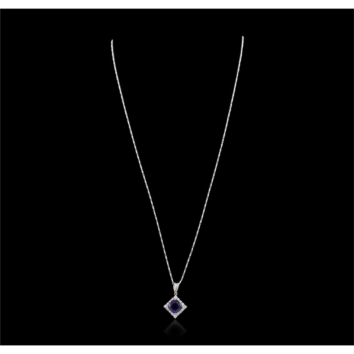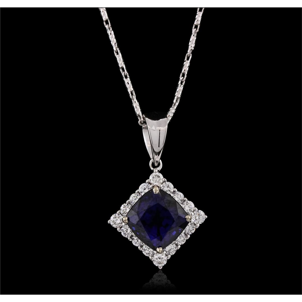 One electronically tested 18KT White Gold ladies cast & assembled sapphire and diamond pendant with chain. The pendant features a sapphire set within a diamond bezel, completed by a White Gold bail. The pendant is supported by an eighteen inch length 14KT White Gold designer style chain, terminating in a lobster claw clasp. Bright polish finish. Identified with markings of "18K 750". Condition is new, good workmanship. Containing: One prong set square cushion brilliant cut blue sapphire, measuring 7.70 x 7.60 x 5.45mm, 6% bulge factor, approximate weight of 3.18ct., clarity is eye clean, type II, dark, moderately strong, blue color, (GIA B 7/4), cut is good. Transmitting light with no distortion, transparent. Indications of laboratory high temperature diffusion treatment. Whether or not this gemstone is natural cannot currently be determined due to diffusion treatment. Graded in the setting. Sixteen prong set round brilliant cut diamonds, measuring 1.90 - 1.80 x 1.11mm (depth est.) approximate total weight of 16 Stones = 0.47ct. Graded in the setting. Clarity: VS-1 to SI-1. Color: F - H. Total Weight of Colored Stones 3.18ct. Total Weight of Diamonds 0.47ct. Total Weight of Pendant With Chain 4.95 grams. AIG Appraised at $2,940.00.