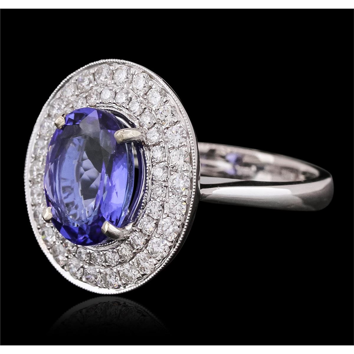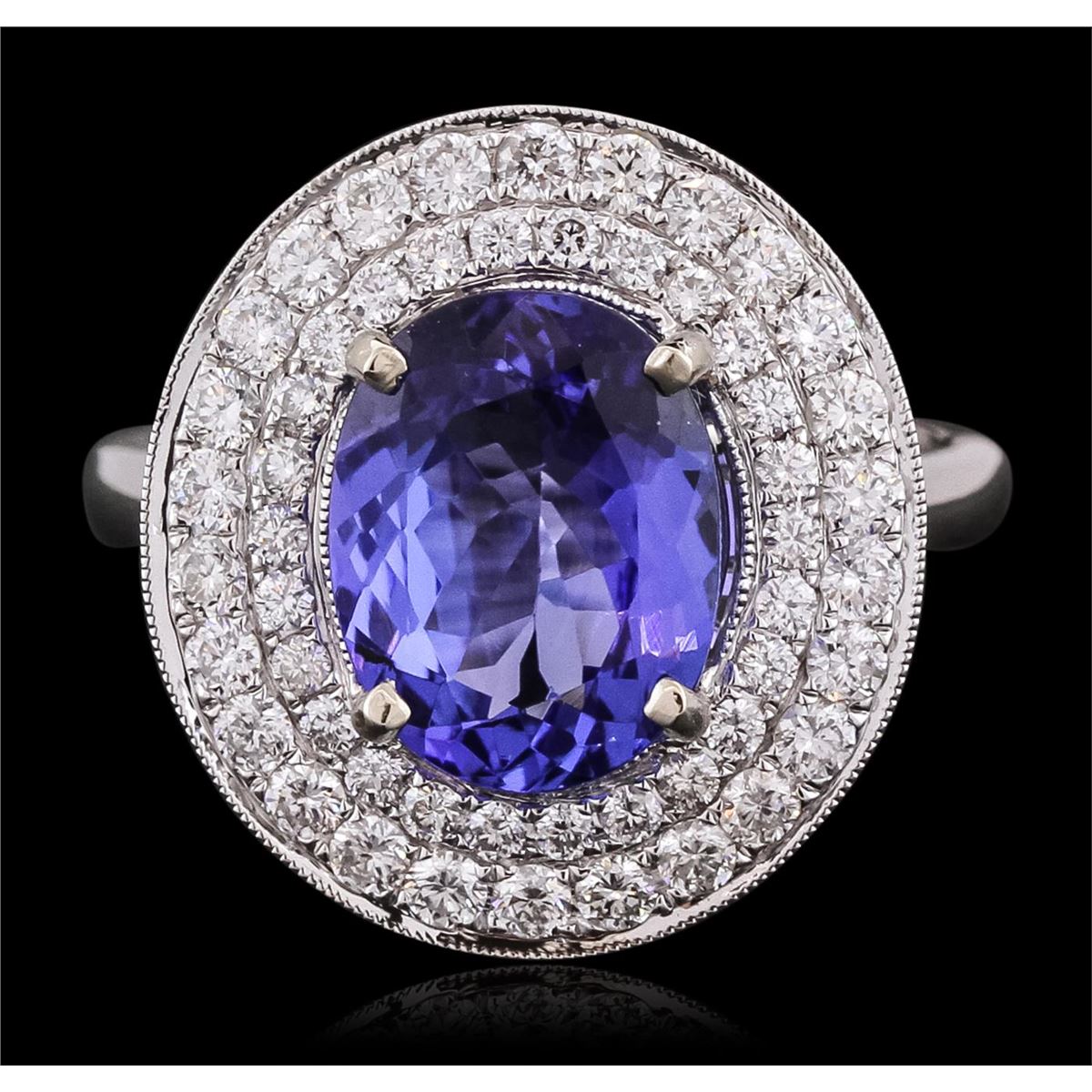 One electronically tested 18KT white gold ladies combination cast & assembled prong set ring with a bright polish finish. Identified with markings of "750". Condition is new. Containing: One prong set oval modified brilliant cut natural tanzanite, measuring 10.71 x 8.35 x 5.34mm, approximate weight of 3.25ct., clarity is eye clean, type I, medium, moderately strong, bluish violet color, (GIA bV 5/4), cut is good. Fifty-Two prong set round brilliant cut diamonds, measuring 1.70 - 1.30 x 0.90mm (depth est.) approximate total weight of 52 Stones = 0.84ct. Clarity: SI-1 to I-1. Color: H, Cut is Good. Colored gemstones are presumed to have been subjected to commonly used enhancement processes. All diamonds and colored gemstones are graded in the mounting, unless otherwise stated. Total Weight of Colored Stones 3.25ct. Total Weight of Diamonds 0.84ct. Total Weight of Ring 7.10 grams. GGL Appraised at $10,000.00.