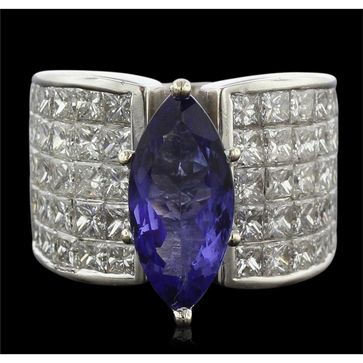 One electronically tested 18KT white gold Ladies combination cast & assembled ring with a bright polish finish. Condition is new. Identified with markings of "18K". Containing: One prong set marquise modified brilliant cut natural tanzanite, measuring 16.00 x 6.85 x 4.66mm, approximate weight of 3.25ct., clarity is eye clean, type I, medium light, moderately strong, bluish violet color, (GIA bV 4/4), cut is good. Colored gemstones are presumed to have been subjected to commonly used color/clarity enhancement processes. Sixty invisible set princess cut diamonds, measuring 2.30 x 2.30 x 1.73mm (depth est.) approximate. Total Weight of 60 Stones = 4.50ct. . Clarity: SI-1 to SI-2. Color: I - J, Cut is Good. Total Weight of Colored Stones 3.25ct. Total Weight of Diamonds 4.50ct. Total Weight of Ring 15.30 grams. GGL Appraised at $19,315.00.