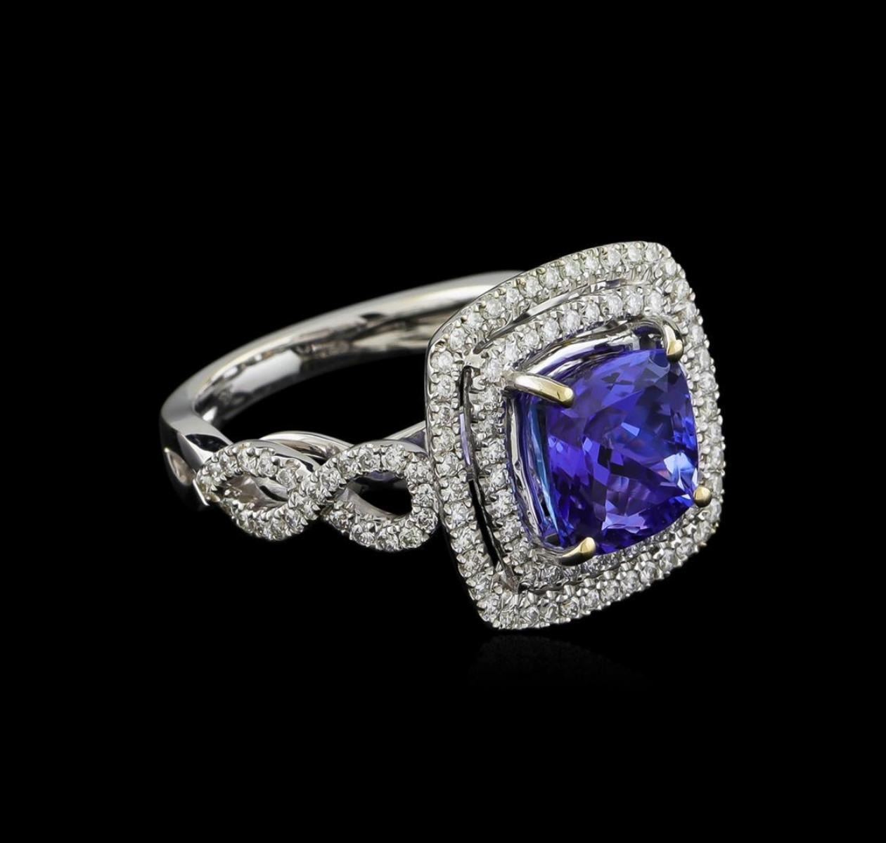 One electronically tested 18KT white gold ladies combination cast & assembled ring with a bright polish finish. Identified with markings of "750". Condition is new. Containing: One prong set square cushion modified brilliant cut natural tanzanite, measuring 8.71 x 8.62 x 5.64mm, approximate weight of 3.33ct., clarity is eye clean, type I, medium light, moderately strong, violet color, (GIA V 4/4), cut is good. One Hundred Twenty-Six prong set round brilliant cut diamonds, measuring 1.10 - 1.10 x 0.66mm (depth est.) approximate total weight of 126 Stones = 0.61ct. Clarity: SI-1 to I-1. Color: H - I, Cut is Good. Colored gemstones are presumed to have been subjected to commonly used enhancement processes. All diamonds and colored gemstones are graded in the mounting, unless otherwise stated. Total Weight of Colored Stones 3.33ct. Total Weight of Diamonds 0.61ct. Total Weight of Ring 8.70 grams. GGL Appraised.