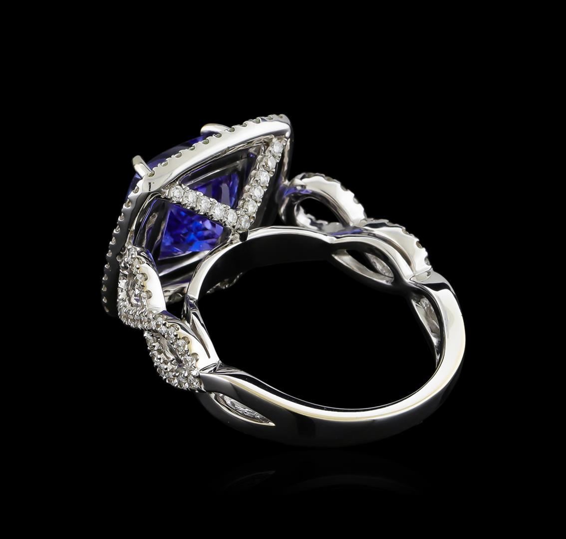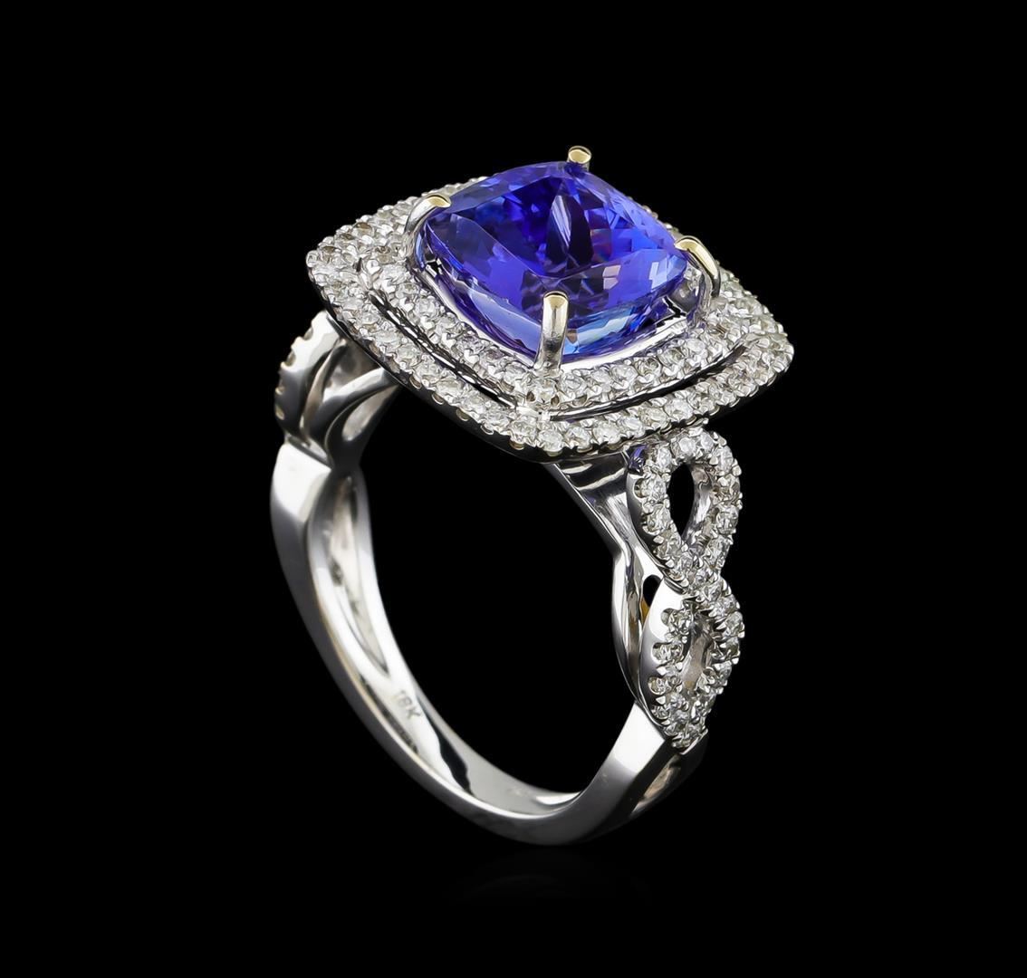 One electronically tested 18KT white gold ladies combination cast & assembled ring with a bright polish finish. Identified with markings of "750". Condition is new. Containing: One prong set square cushion modified brilliant cut natural tanzanite, measuring 8.71 x 8.62 x 5.64mm, approximate weight of 3.33ct., clarity is eye clean, type I, medium light, moderately strong, violet color, (GIA V 4/4), cut is good. One Hundred Twenty-Six prong set round brilliant cut diamonds, measuring 1.10 - 1.10 x 0.66mm (depth est.) approximate total weight of 126 Stones = 0.61ct. Clarity: SI-1 to I-1. Color: H - I, Cut is Good. Colored gemstones are presumed to have been subjected to commonly used enhancement processes. All diamonds and colored gemstones are graded in the mounting, unless otherwise stated. Total Weight of Colored Stones 3.33ct. Total Weight of Diamonds 0.61ct. Total Weight of Ring 8.70 grams. GGL Appraised.