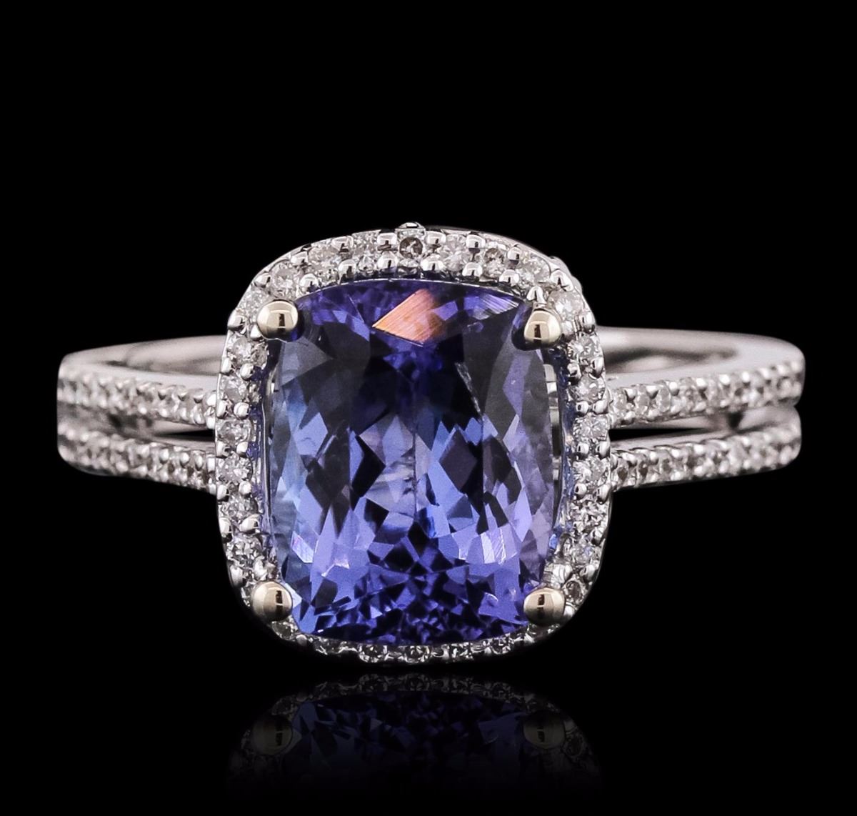 One electronically tested 18KT White Gold ladies cast tanzanite and diamond ring with a bright polish finish. The featured tanzanite is set within a diamond bezel supported by a diamond set under gallery and diamond set split shoulders, completed by a two and one-half millimeter wide band. Identified with markings of "18K 750". Condition is new, good workmanship. Containing: One prong set rectangular cushion mixed cut natural tanzanite, measuring 9.50 x 7.40 x 5.70mm, 8% bulge factor, approximate weight of 3.41ct., clarity is eye clean, type I, medium dark, slightly grayish, bluish violet color, (GIA bV 6/2), cut is good. Transmitting light with no distortion, transparent. Graded in the setting. Tanzanite is a very rare gemstone that is only found in the country of Tanzania. Originally discovered in 1967. Tiffany & Company, named the stone Tanzanite. It is found in the Usumburu Mountains that border the Umba Valley of northern Tanzania. Tanzanite occurs in gray, brown, violet, blue, reddish-purple, & green. The gem is interesting because of its exceptional pleochroism. Rotated in different directions a tanzanite will exhibit multiple changes of color. Tanzanite has a low tolerance to ultrasonic cleaning, and should not be cleaned using this method. Ninety-Six prong set round brilliant cut diamonds approximate total weight of 96 Stones = 0.39ct. Graded in the setting. Clarity: VS-1 to SI-1. Color: H - J. Total Weight of Colored Stones 3.41ct. Total Weight of Diamonds 0.39ct. Total Weight of Ring 5.38 grams. AIG Appraised at $9,505.00.