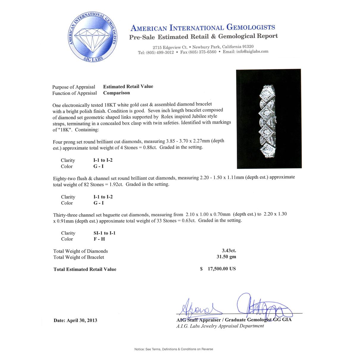 One electronically tested 18KT white gold cast & assembled diamond bracelet with a bright polish finish. Condition is good. Seven inch length bracelet composed of diamond set geometric shaped links supported by Rolex inspired Jubilee style straps, terminating in a concealed box clasp with twin safeties. Identified with markings of "18K". Containing: Four prong set round brilliant cut diamonds, measuring 3.85 -- 3.70 x 2.27mm (depth est.) approximate total weight of 4 Stones = 0.88ct. Graded in the setting. Clarity I-1 to I-2. Color G -- I. Eight-two flush & channel set round brilliant cut diamonds, measuring 2.20 -- 1.50 x 1.11mm (depth est.) approximate total weight of 82 Stones = 1.92ct. Graded in the setting. Clarity I-1 to I-2. Color G -- I. Thirty-three set baguette cut diamonds, measuring from 2.10 x 1.00 x 0.70mm (depth est.) to 2.20 x 1.30 x 0.91mm (depth est.) approximate total weight of 33 Stones = 0.63ct. Graded in the setting. Clarity SI-1 to I-1. Color F -- H. Total Weight of Diamonds 3.43ct. Total Weight of Bracelet 31.50 gm. AIG Appraised at $17,500.00.
