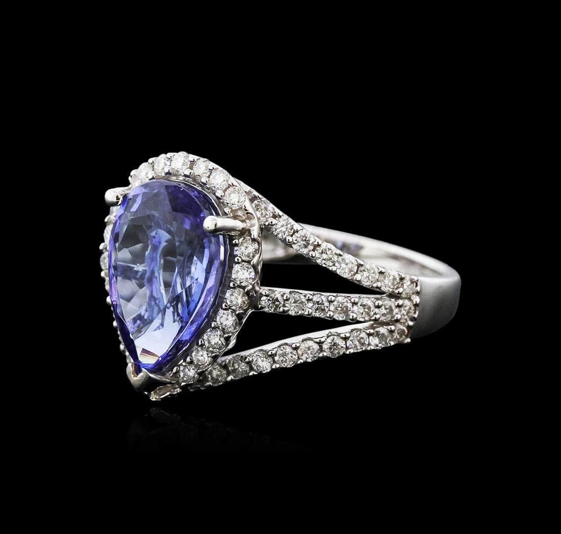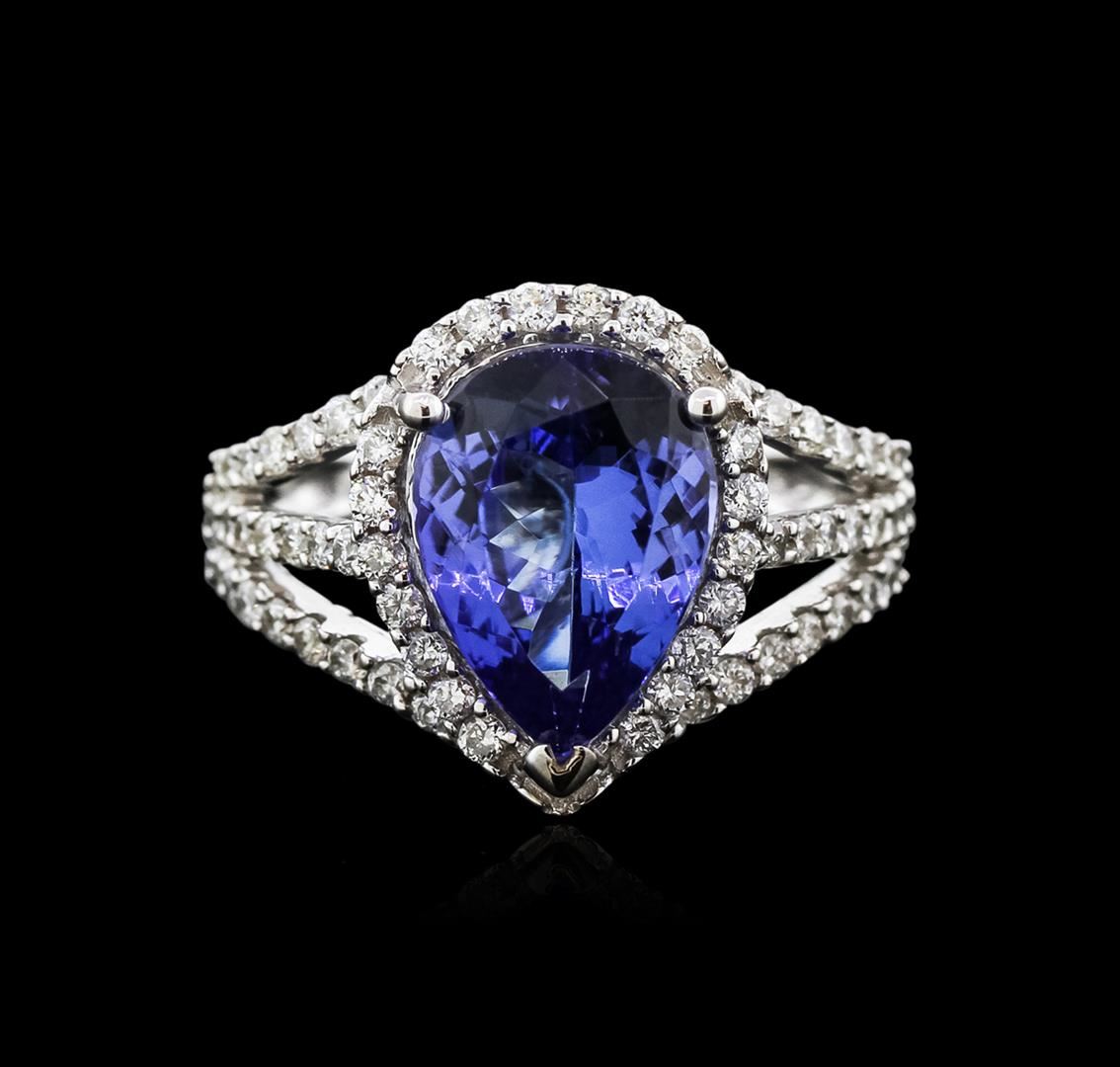One electronically tested 18KT white gold ladies cast tanzanite and diamond ring with a bright polish finish. Identified with markings of "18K". Condition is new. Containing: One prong set pear modified brilliant cut natural tanzanite, measuring 13.00 x 7.80 x 5.07mm, approximate weight of 3.44ct., clarity is eye clean, type I, medium, moderately strong, violet color, (GIA V 5/4), cut is good. Seventy-Two prong set round brilliant cut diamonds, measuring 1.30 - 1.30 x 0.78mm (depth est.) approximate total weight of 72 Stones = 1.00ct. Clarity: SI-2 to I-2. Color: I - J. All diamonds and colored gemstones are graded in the mounting, unless otherwise stated. Colored gemstones are presumed to have been subjected to commonly used enhancement processes. Total Weight of Colored Stones 3.44ct. Total Weight of Diamonds 1.00ct. Total Weight of Ring 5.60 grams. GGL Appraised at $6,325.00.