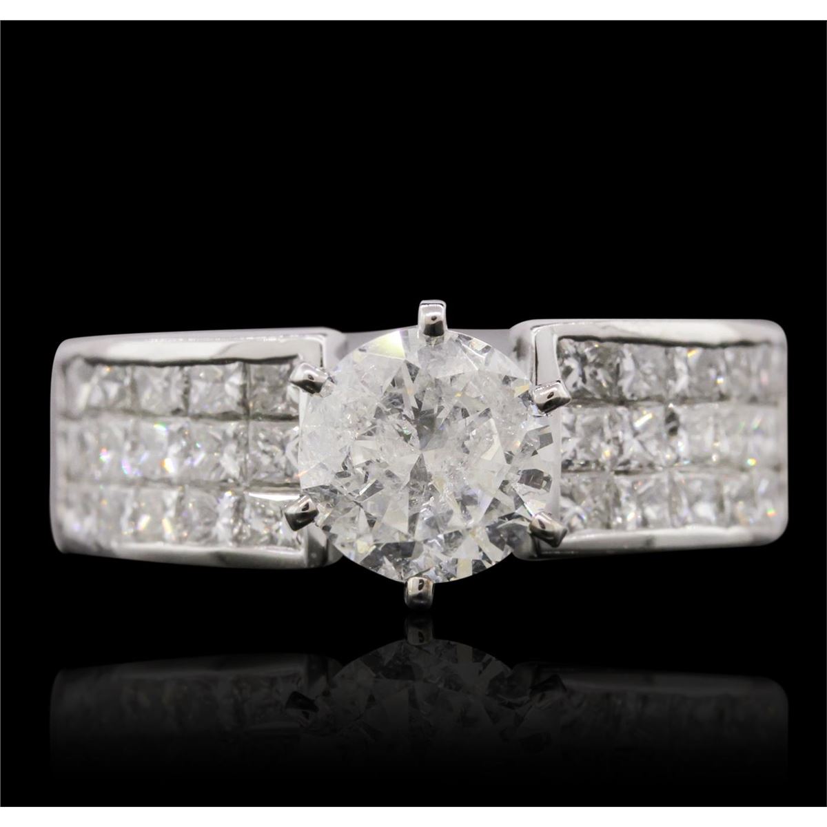 One electronically tested 18KT white gold Ladies combination cast & assembled engagement ring with a bright polish finish. Condition is new. Containing: One prong set round brilliant cut diamond, measuring 7.80 - 7.80 x 4.50mm (depth est.) approximate weight of 1.67ct. Clarity: I-2. Color: H, Cut is Good. Thirty-Six invisible set princess cut diamonds, measuring 2.00 x 2.00 x 1.51mm (depth est.) approximate. Total Weight of 36 Stones = 1.78ct. Clarity: SI-2 to I-1. Color: I - J, Cut is Good. Total Weight of Diamonds 3.45ct. Total Weight of Engagement Ring 8.20 grams. GGL Appraised at $23,910.00.