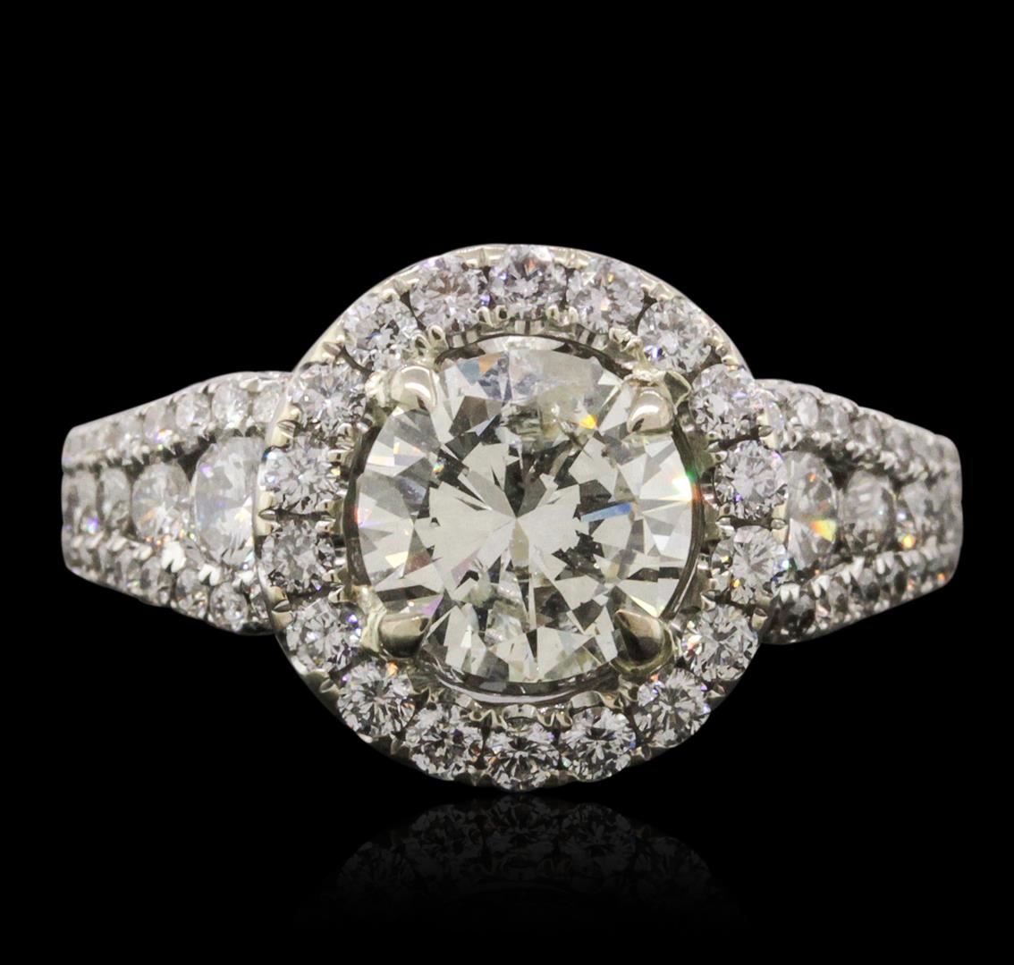 One electronically tested 18KT white gold ladies combination cast & assembled engagement ring with a bright polish finish. Condition is very good. Identified with markings of "750". Containing: One prong set round brilliant cut diamond, measuring 7.55 - 7.51 x 4.52mm (depth est.) approximate weight of 1.56ct. Clarity: I-1. Color: L, Cut is Very Good. Two channel set round brilliant cut diamonds, measuring 3.50 - 3.50 x 2.10mm (depth est.) approximate. Total Weight of 2 Stones = 0.31ct. Clarity: I-1. Color: I - J, Cut is Good. One Hundred Thirty-Four prong set round brilliant cut diamonds, measuring 2.00 - 1.10 x 0.93mm (depth est.) approximate. Total Weight of 134 Stones = 1.60ct. Clarity: SI-2 to I-1. Color: I - J, Cut is Good. All diamonds are graded in the mounting, unless otherwise stated. Total Weight of Diamonds 3.48ct. Total Weight of Ring 7.10 grams. GGL Appraised at $29,555.00.