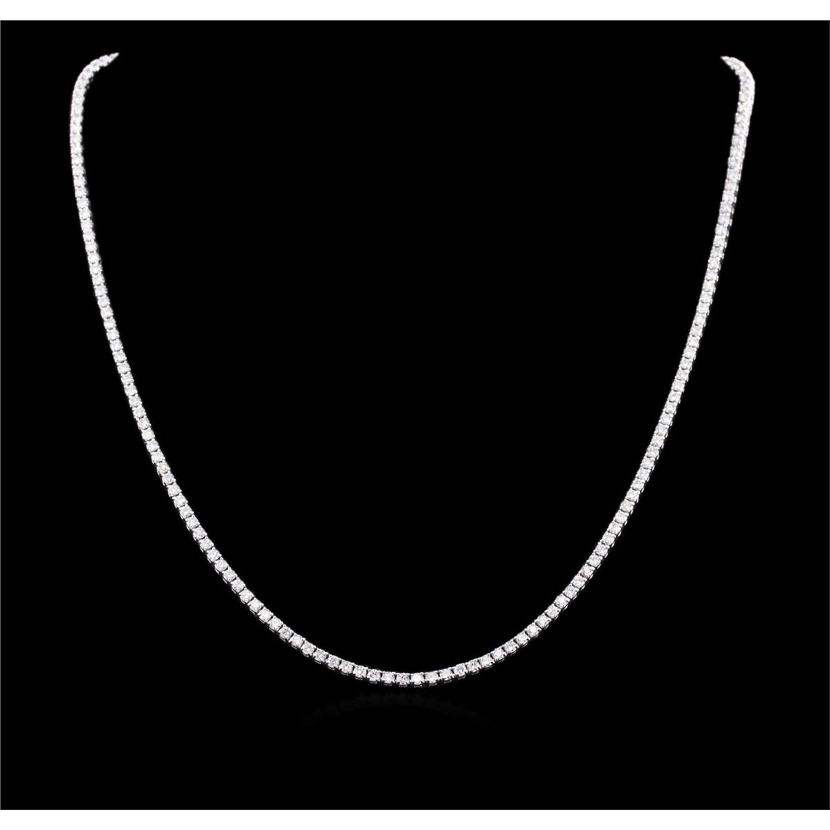One electronically tested 18KT white gold ladies cast diamond necklace with a hidden box clasp with a bright polish finish. Measurements: 16.5" in length. Identified with markings of "750". Condition is new. Containing: One Hundred Forty-One prong set round brilliant cut diamonds, measuring 1.90 - 1.90 x 1.14mm (depth est.) approximate total weight of 141 Stones = 3.54ct. Clarity: SI-2 to I-1. Color: I - J, Cut is Good. All diamonds are graded in the mounting, unless otherwise stated. Total Weight of Diamonds 3.54ct. Total Weight of Necklace 15.50 grams. GGL Appraised at $13,960.00.