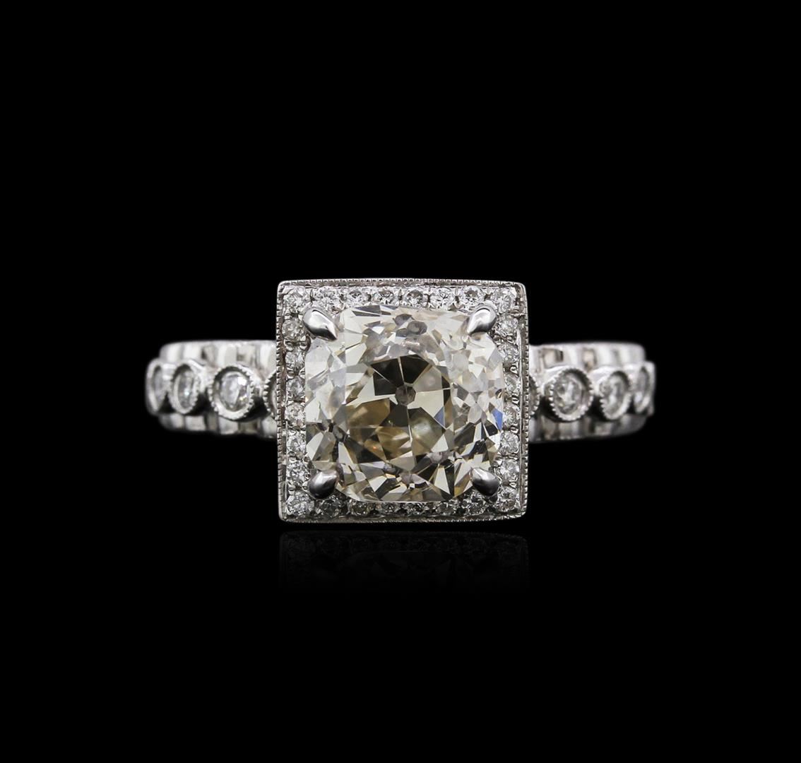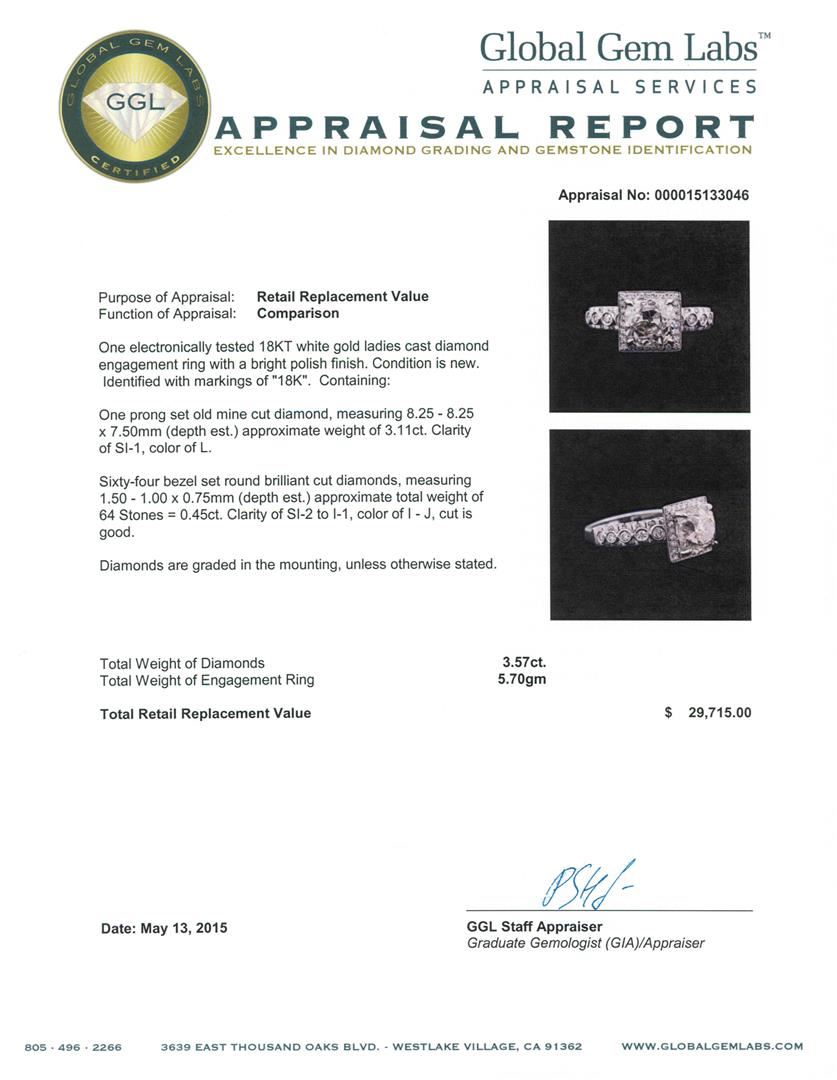 One electronically tested 18KT white gold ladies cast diamond engagement ring with a bright polish finish. Identified with markings of "18K". Condition is new. Containing: One prong set old mine cut diamond, measuring 8.25 - 8.25 x 7.50mm (depth est.) approximate weight of 3.11ct. Clarity: SI-1. Color: L. Sixty-Four bezel set round brilliant cut diamonds, measuring 1.50 - 1.00 x 0.75mm (depth est.) approximate total weight of 64 Stones = 0.45ct. Clarity: SI-2 to I-1. Color: I - J, Cut is Good. Diamonds are graded in the mounting, unless otherwise stated. Total Weight of Diamonds 3.57ct. Total Weight of Engagement Ring 5.70 grams. GGL Appraised at $29,715.00.