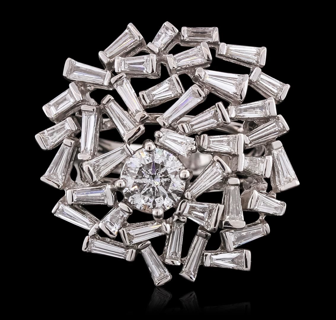 One electronically tested 18KT white gold ladies combination cast & assembled diamond ring with a bright polish finish. Identified with markings of "18K". Condition is new. Containing: One prong set round brilliant cut diamond, measuring 6.60 - 6.60 x 4.21mm (depth est.) approximate weight of 1.12ct. Clarity: I-2. Color: J, Cut is Good. Forty prong set baguette cut (tapered) diamonds, measuring from 2.50 x 1.50 x 1.28mm (depth est.) to 4.50 x 1.50 x 1.28mm (depth est.) approximate total weight of 40 Stones = 2.46ct. Clarity: VS-2 to SI-1. Color: H - I, Cut is Good. All diamonds are graded in the mounting, unless otherwise stated. Total Weight of Diamonds 3.58ct. Total Weight of Ring 12.10 grams. GGL Appraised at $25,280.00.