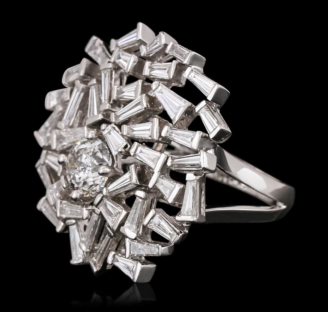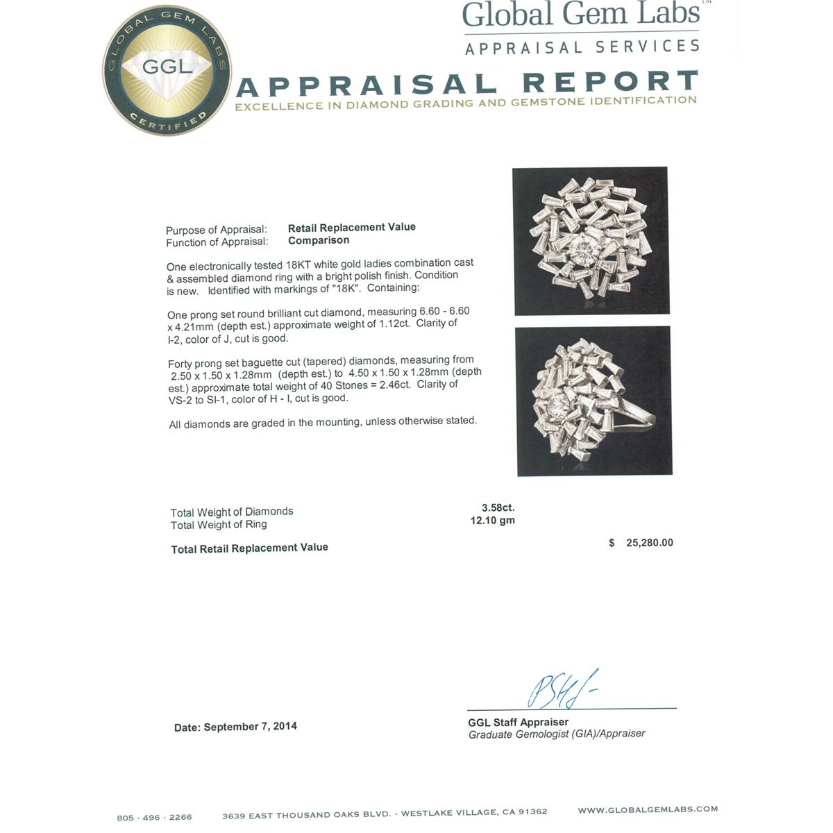 One electronically tested 18KT white gold ladies combination cast & assembled diamond ring with a bright polish finish. Identified with markings of "18K". Condition is new. Containing: One prong set round brilliant cut diamond, measuring 6.60 - 6.60 x 4.21mm (depth est.) approximate weight of 1.12ct. Clarity: I-2. Color: J, Cut is Good. Forty prong set baguette cut (tapered) diamonds, measuring from 2.50 x 1.50 x 1.28mm (depth est.) to 4.50 x 1.50 x 1.28mm (depth est.) approximate total weight of 40 Stones = 2.46ct. Clarity: VS-2 to SI-1. Color: H - I, Cut is Good. All diamonds are graded in the mounting, unless otherwise stated. Total Weight of Diamonds 3.58ct. Total Weight of Ring 12.10 grams. GGL Appraised at $25,280.00.