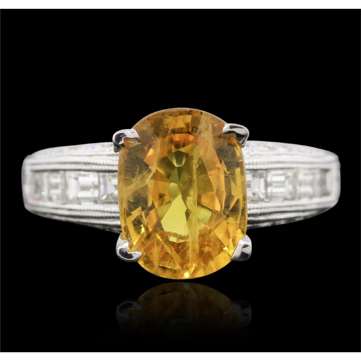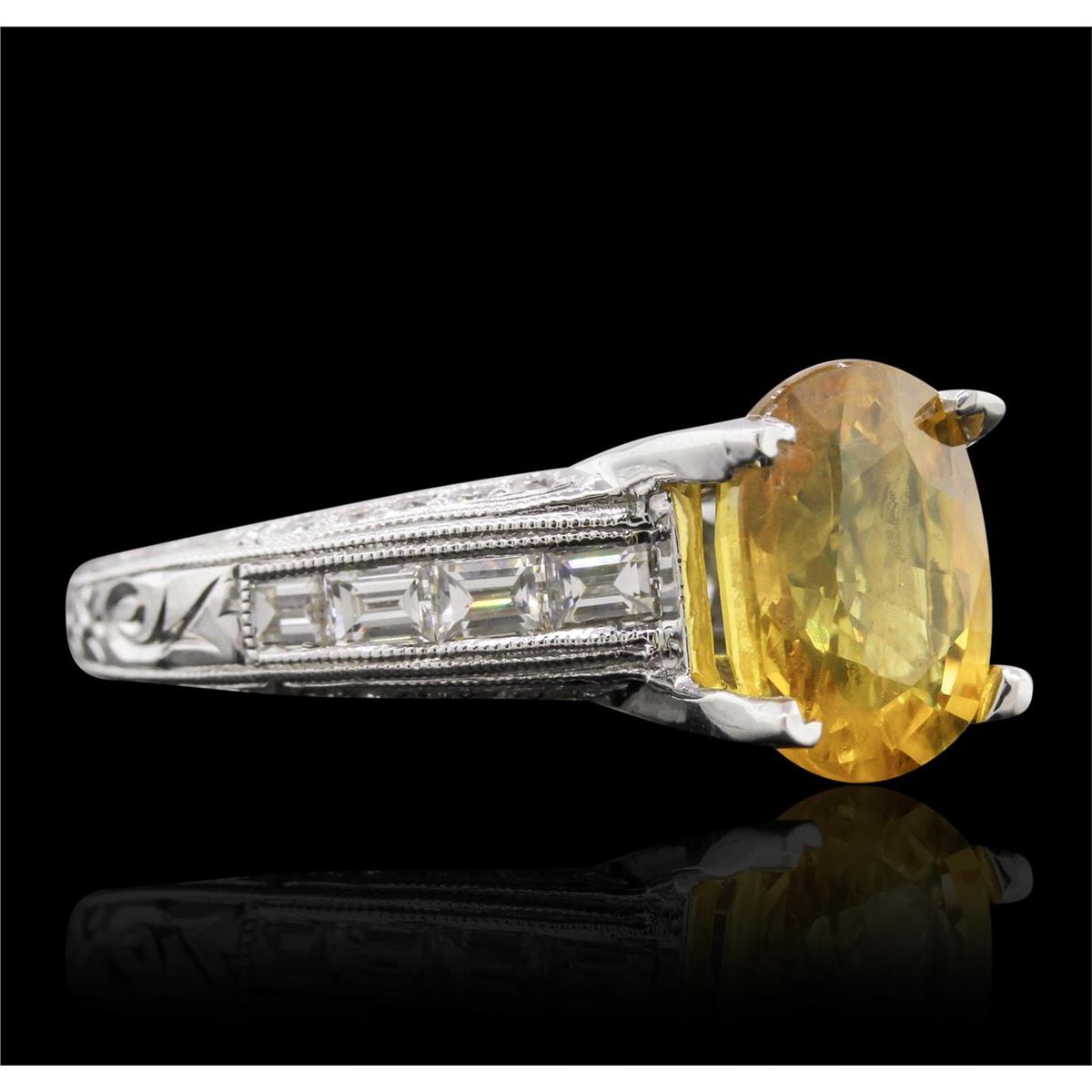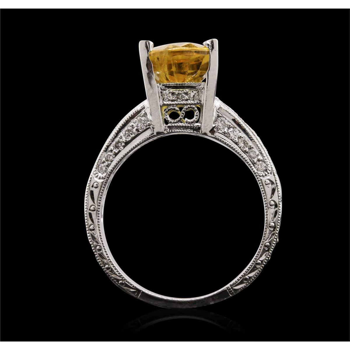 One electronically tested 18KT white gold Ladies combination cast & assembled ring with a engraved finish. Condition is new. Identified with markings of "18K". Containing: One prong set oval modified brilliant cut natural yellow sapphire, measuring 10.50 x 7.90 x 5.30mm, approximate weight of 3.59ct., clarity is eye clean, type II, medium light, brownish, yellow color, (GIA Y 4/3), cut is very good. Colored gemstones are presumed to have been subjected to commonly used color/clarity enhancement processes. Twenty-Six bead set round brilliant cut diamonds, measuring 1.40 - 1.30 x 0.81mm (depth est.) approximate. Total Weight of 26 Stones = 0.23ct. Clarity: SI-1 to I-1. Color: I - J, Cut is Good. Eight channel set baguette cut diamonds, measuring from 2.00 x 1.50 x 1.28mm (depth est.) to 2.50 x 1.50 x 1.28mm (depth est.) approximate. Total Weight of 8 Stones = 0.32ct. Clarity: VS-2. Color: I - J, Cut is Very Good. Total Weight of Colored Stones 3.59ct. Total Weight of Diamonds 0.55ct. Total Weight of Ring 6.50 grams. GGL Appraised at $6,965.00.