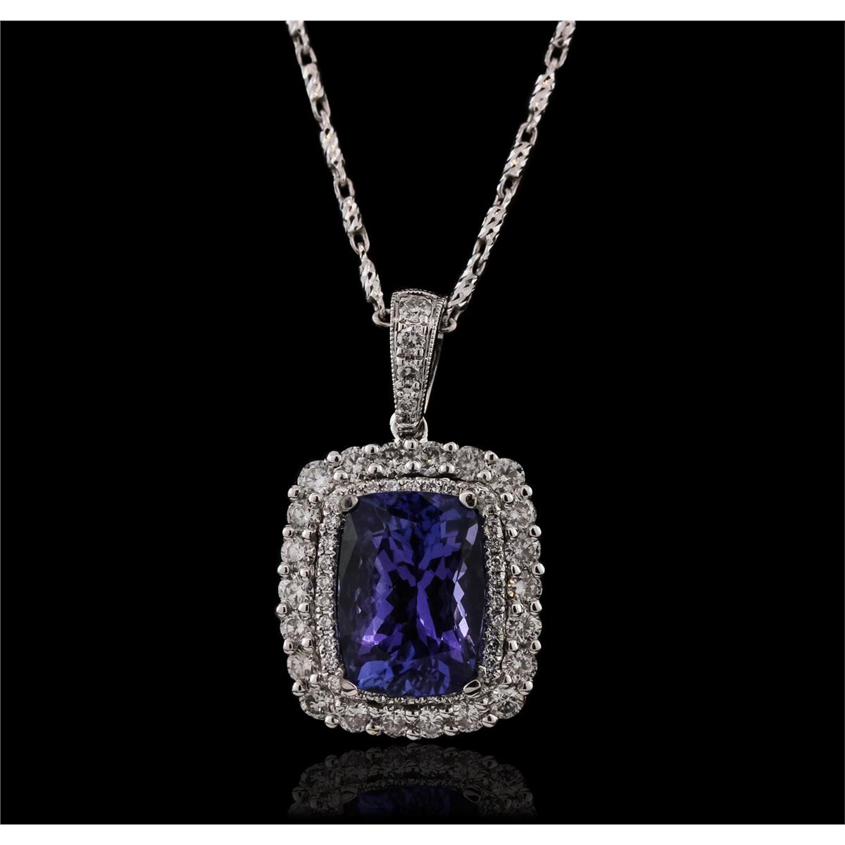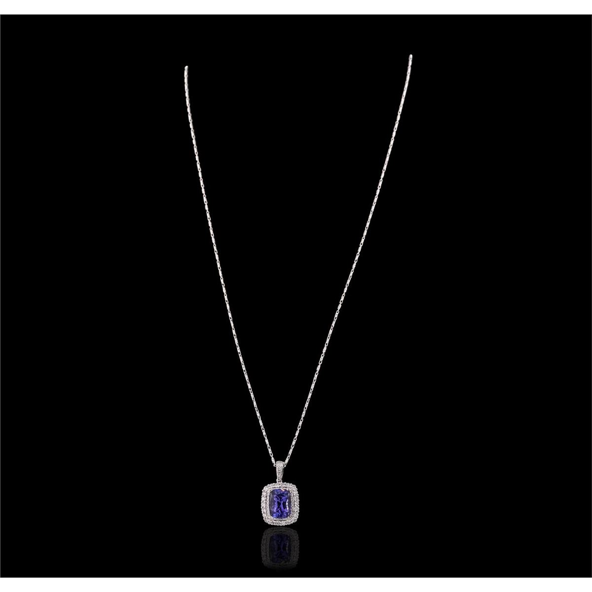 One electronically tested 18KT White Gold ladies cast tanzanite and diamond pendant with chain. The pendant features a tanzanite set within two tiered diamond bezels, completed by a diamond set bail. The pendant is supported by an eighteen inch length 14KT White Gold designer style chain, terminating in a lobster claw clasp. Bright polish finish. Identified with markings of "18K 750". Condition is new, good workmanship. Containing: One prong set rectangular cushion brilliant cut natural tanzanite, measuring 10.30 x 7.25 x 5.65mm, 8% bulge factor, approximate weight of 3.59ct., clarity is eye clean, type I, dark, very slightly grayish, bluish violet color, (GIA bV 7/3), cut is good. Transmitting light with no distortion, transparent. Graded in the setting. Tanzanite is a very rare gemstone that is only found in the country of Tanzania. Originally discovered in 1967. Tiffany & Company, named the stone Tanzanite. It is found in the Usumburu Mountains that border the Umba Valley of northern Tanzania. Tanzanite occurs in gray, brown, violet, blue, reddish-purple, & green. The gem is interesting because of its exceptional pleochroism. Rotated in different directions a tanzanite will exhibit multiple changes of color. Tanzanite has a low tolerance to ultrasonic cleaning, and should not be cleaned using this method. Twenty-Six prong set round brilliant cut diamonds, measuring 1.90 - 1.80 x 1.11mm (depth est.) approximate total weight of 26 Stones = 0.70ct. Graded in the setting. Clarity: VS-2 to SI-2. Color: G - I Thirty-Four prong set round brilliant cut diamonds, measuring 1.00 - 0.90 x 0.57mm (depth est.) approximate total weight of 34 Stones = 0.20ct. Graded in the setting. Clarity: VS-1 to SI-1. Color: G - I. Total Weight of Colored Stones 3.59ct. Total Weight of Diamonds 0.90ct. Total Weight of Pendant With Chain 6.27 grams. AIG Appraised at $13,310.00.