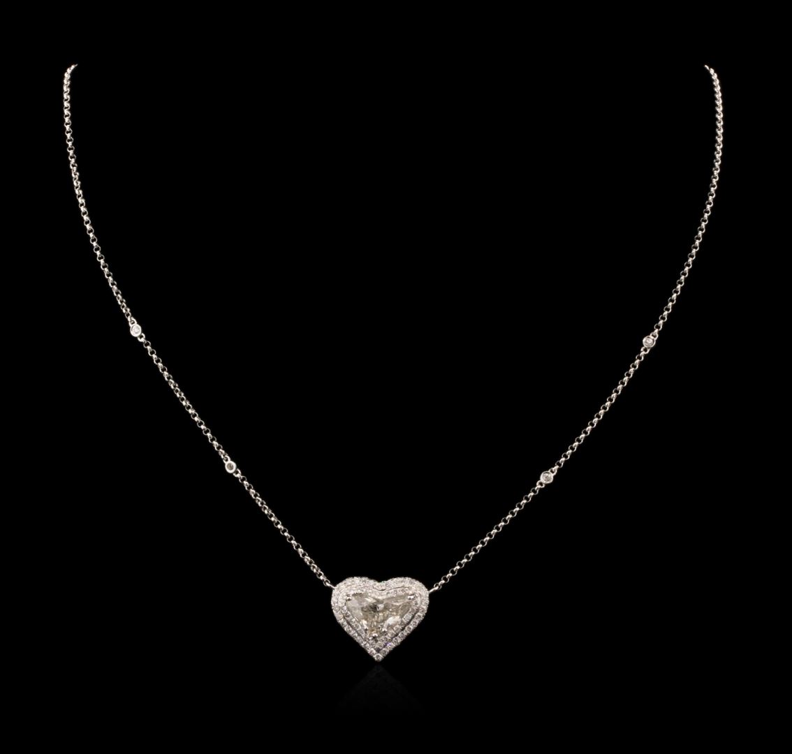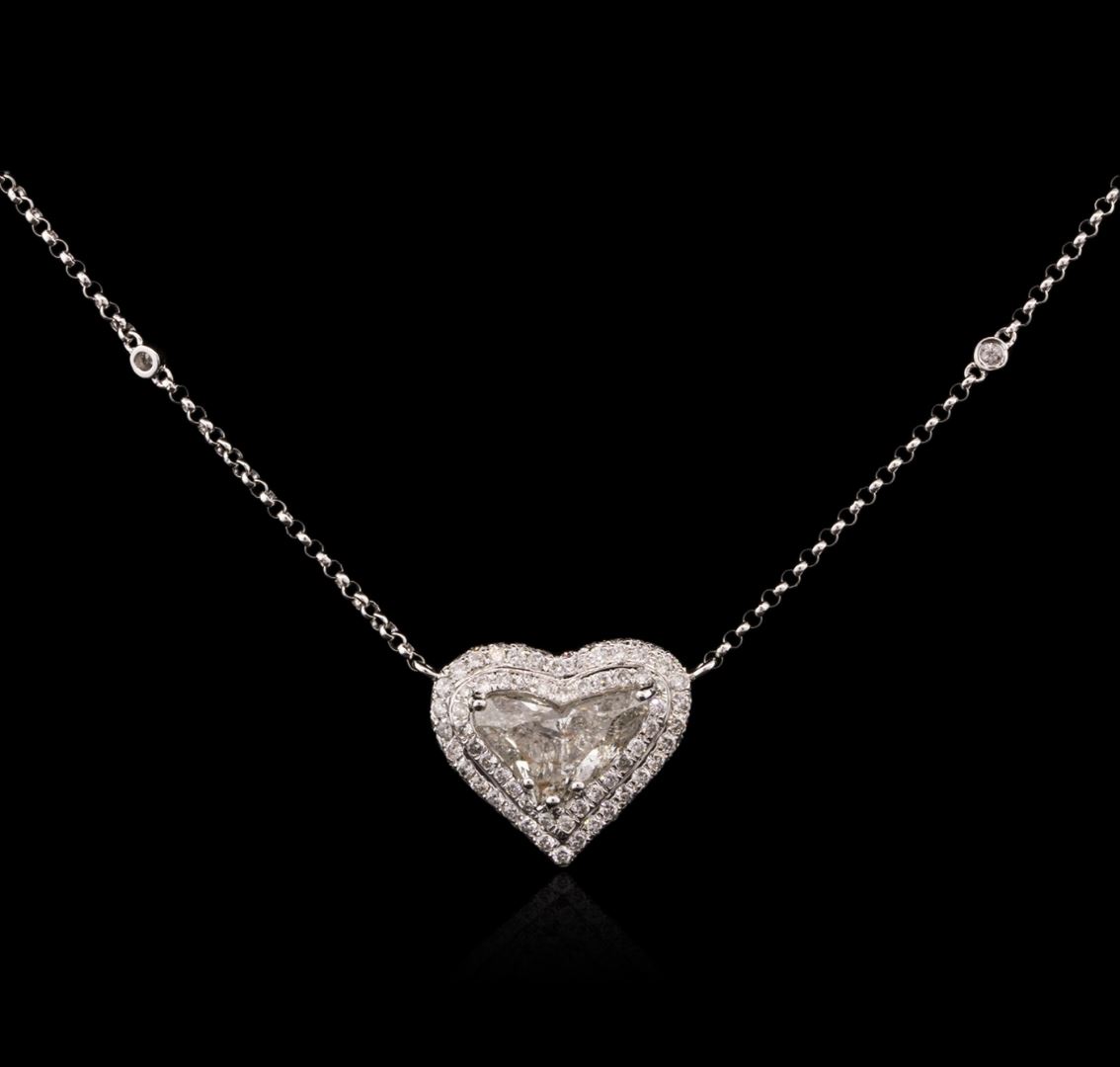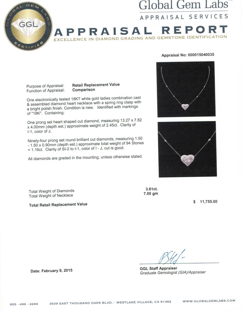 One electronically tested 18KT white gold ladies combination cast & assembled diamond heart necklace with a spring ring clasp with a bright polish finish. Identified with markings of "18K". Condition is new. Containing: One prong set heart shaped cut diamond, measuring 13.27 x 7.82 x 4.00mm (depth est.) approximate weight of 2.45ct. Clarity: I-1. Color: J. Ninety-Four prong set round brilliant cut diamonds, measuring 1.50 - 1.50 x 0.90mm (depth est.) approximate total weight of 94 Stones = 1.16ct. Clarity: SI-2 to I-1. Color: I - J, Cut is Good. All diamonds are graded in the mounting, unless otherwise stated. Total Weight of Diamonds 3.61ct. Total Weight of Necklace 7.00 grams. GGL Appraised at $11,755.00.