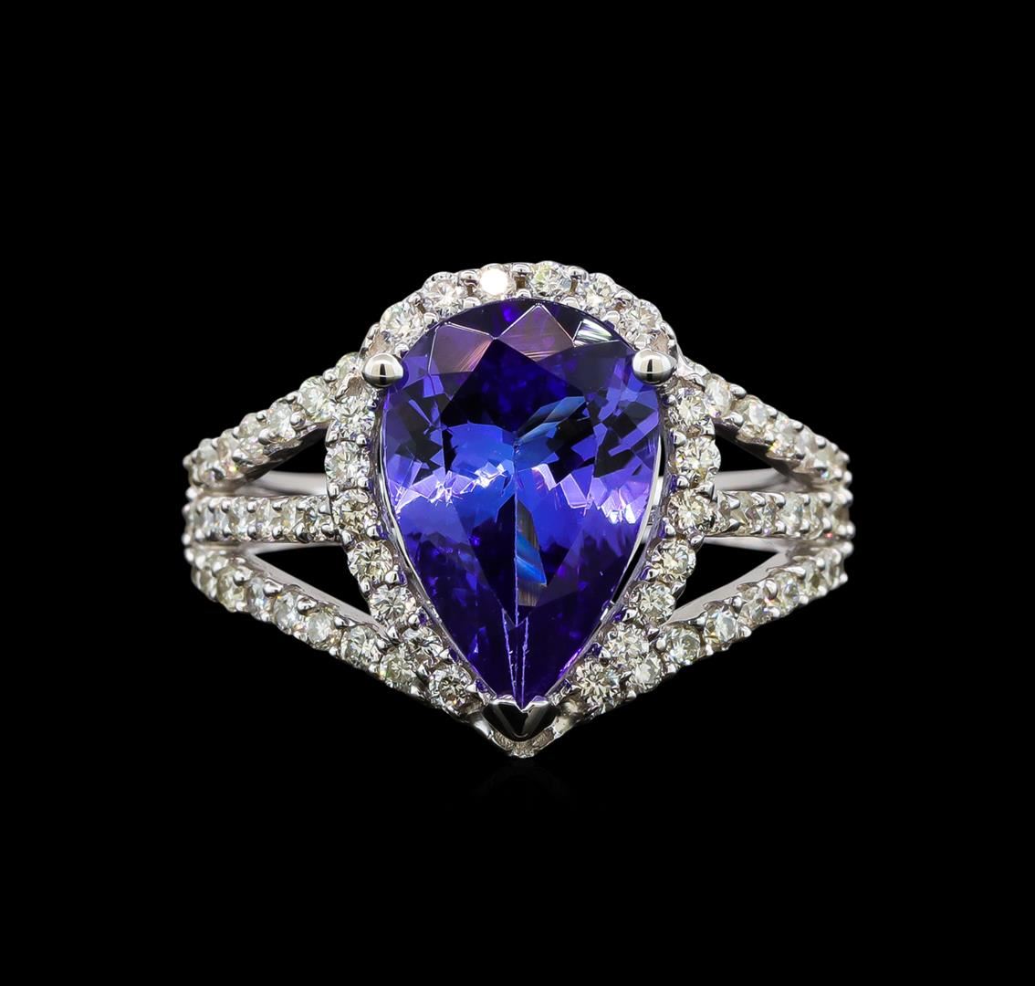 One electronically tested 18KT white gold ladies cast tanzanite and diamond ring with a tapered shank with a bright polish finish. Trademark is Orianne. Identified with markings of "18K". Condition is new. Containing: One prong set pear modified brilliant cut natural tanzanite, measuring 12.76 x 8.60 x 4.93mm, approximate weight of 3.62ct., clarity is eye clean, type I, medium, moderately strong, violetish blue color, (GIA vB 5/4), cut is good. Sixty-Eight prong set round brilliant cut diamonds, measuring 1.20 - 1.20 x 0.72mm (depth est.) approximate total weight of 68 Stones = 0.43ct. Clarity: I-1 to I-2. Color: I - J. All diamonds and colored gemstones are graded in the mounting, unless otherwise stated. Colored gemstones are presumed to have been subjected to commonly used enhancement processes. Total Weight of Colored Stones 3.62ct. Total Weight of Diamonds 0.43ct. Total Weight of Ring 5.60 grams. GGL Appraised at $5,310.00.