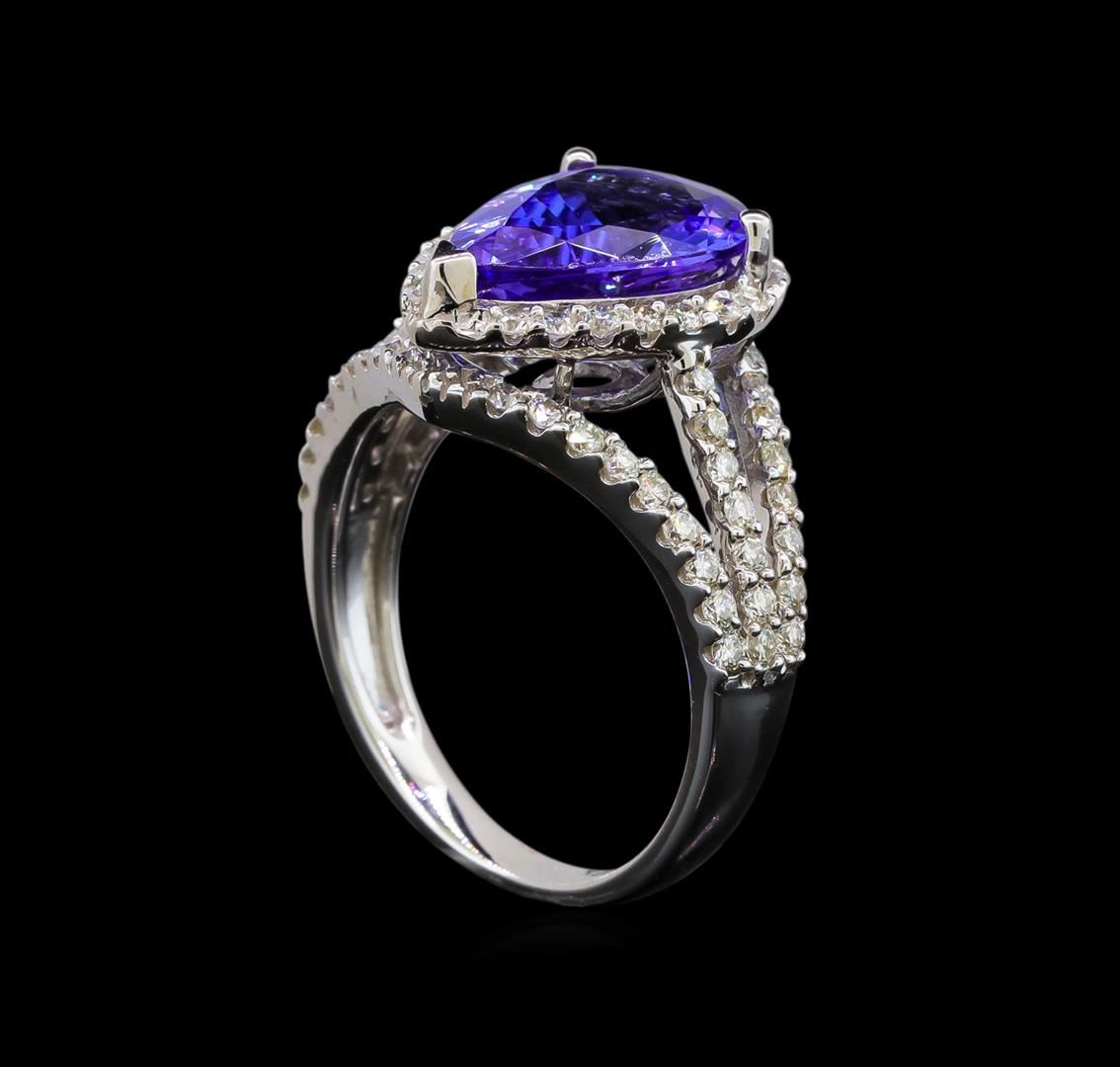 One electronically tested 18KT white gold ladies cast tanzanite and diamond ring with a tapered shank with a bright polish finish. Trademark is Orianne. Identified with markings of "18K". Condition is new. Containing: One prong set pear modified brilliant cut natural tanzanite, measuring 12.76 x 8.60 x 4.93mm, approximate weight of 3.62ct., clarity is eye clean, type I, medium, moderately strong, violetish blue color, (GIA vB 5/4), cut is good. Sixty-Eight prong set round brilliant cut diamonds, measuring 1.20 - 1.20 x 0.72mm (depth est.) approximate total weight of 68 Stones = 0.43ct. Clarity: I-1 to I-2. Color: I - J. All diamonds and colored gemstones are graded in the mounting, unless otherwise stated. Colored gemstones are presumed to have been subjected to commonly used enhancement processes. Total Weight of Colored Stones 3.62ct. Total Weight of Diamonds 0.43ct. Total Weight of Ring 5.60 grams. GGL Appraised at $5,310.00.