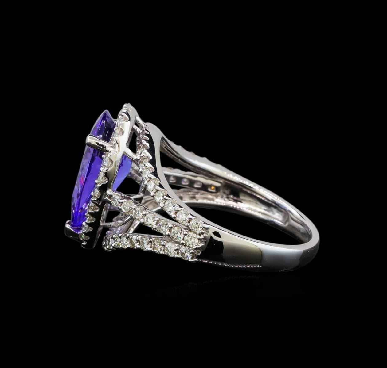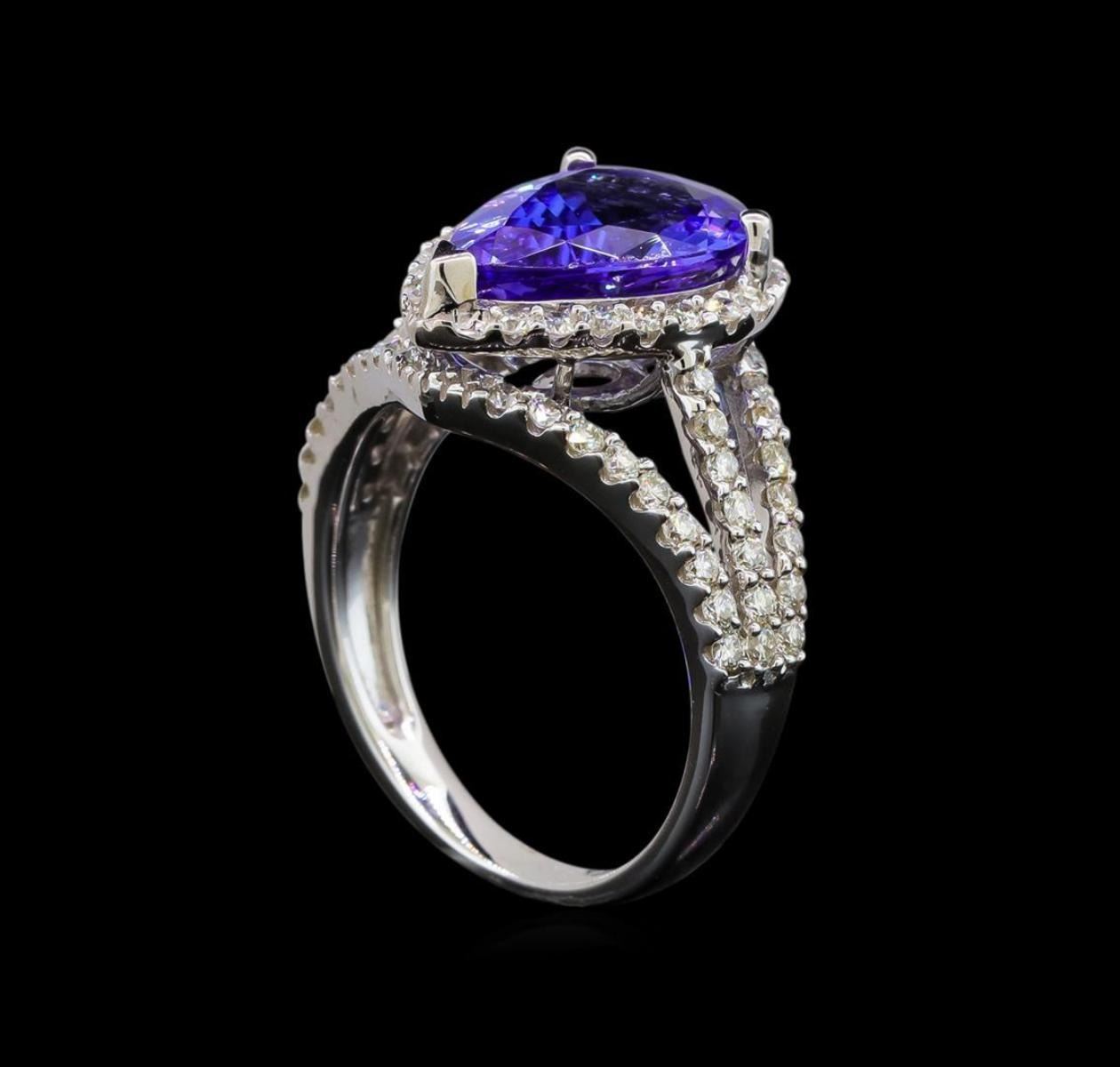 One electronically tested 18KT white gold ladies cast tanzanite and diamond ring with a tapered shank with a bright polish finish. Trademark is Orianne. Identified with markings of "18K". Condition is new. Containing: One prong set pear modified brilliant cut natural tanzanite, measuring 12.76 x 8.60 x 4.93mm, approximate weight of 3.62ct., clarity is eye clean, type I, medium, moderately strong, violetish blue color, (GIA vB 5/4), cut is good. Sixty-Eight prong set round brilliant cut diamonds, measuring 1.20 - 1.20 x 0.72mm (depth est.) approximate total weight of 68 Stones = 0.43ct. Clarity: I-1 to I-2. Color: I - J. All diamonds and colored gemstones are graded in the mounting, unless otherwise stated. Colored gemstones are presumed to have been subjected to commonly used enhancement processes. Total Weight of Colored Stones 3.62ct. Total Weight of Diamonds 0.43ct. Total Weight of Ring 5.60 grams. GGL Appraised.