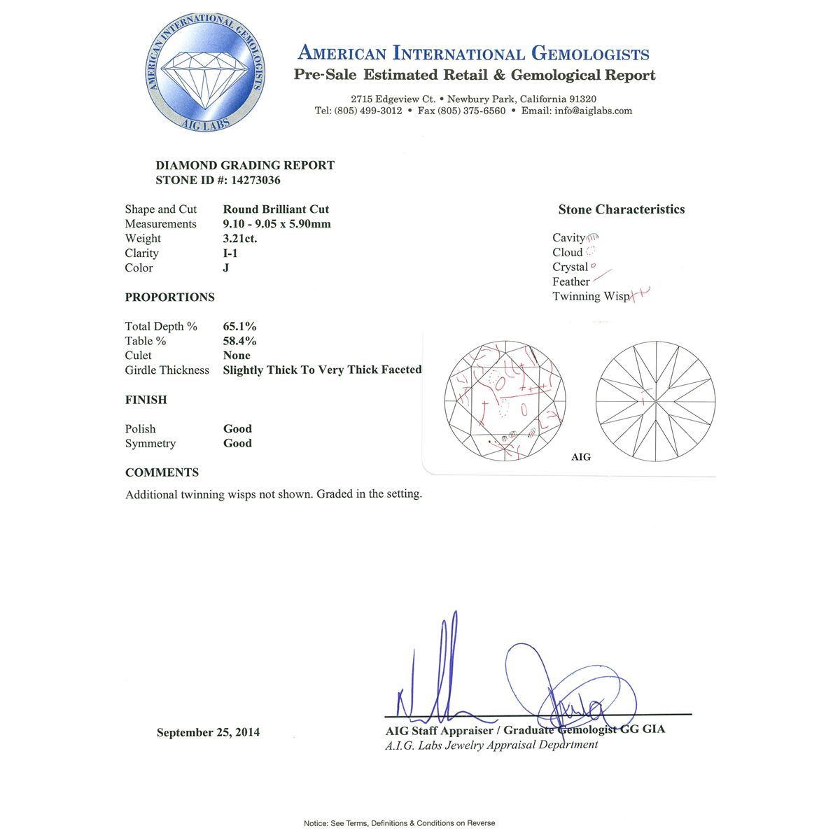 One electronically tested 18KT white gold ladies cast & assembled diamond wedding set. The wedding set includes a diamond engagement ring and a diamond wedding band. The engagement ring features a diamond supported by diamond set split shoulders. The matching wedding band slides under the engagement ring, giving the wedding set a stylized three dimensional design, Bright polish finish. with milgrain detailing. Identified with markings of "18K". Condition is new, good workmanship. Containing: One prong set round brilliant cut diamond, measuring 9.10 - 9.05 x 5.90mm (depth est.), 5.00% GTCF approximate weight of 3.21ct. Diamond Grading Report attached. Graded in the setting. Clarity: I-1. Color: 65.1%. Table 58.4%. Thirty-Nine bead set round brilliant cut diamonds, measuring 1.40 - 1.30 x 0.81mm (depth est.) approximate total weight of 39 Stones = 0.45ct. Graded in the setting. Clarity: SI-1 to I-1. Color: H - J. Total Weight of Diamonds 3.66ct. Total Weight of Wedding Set 9.94 grams. AIG Appraised at $54,805.00.