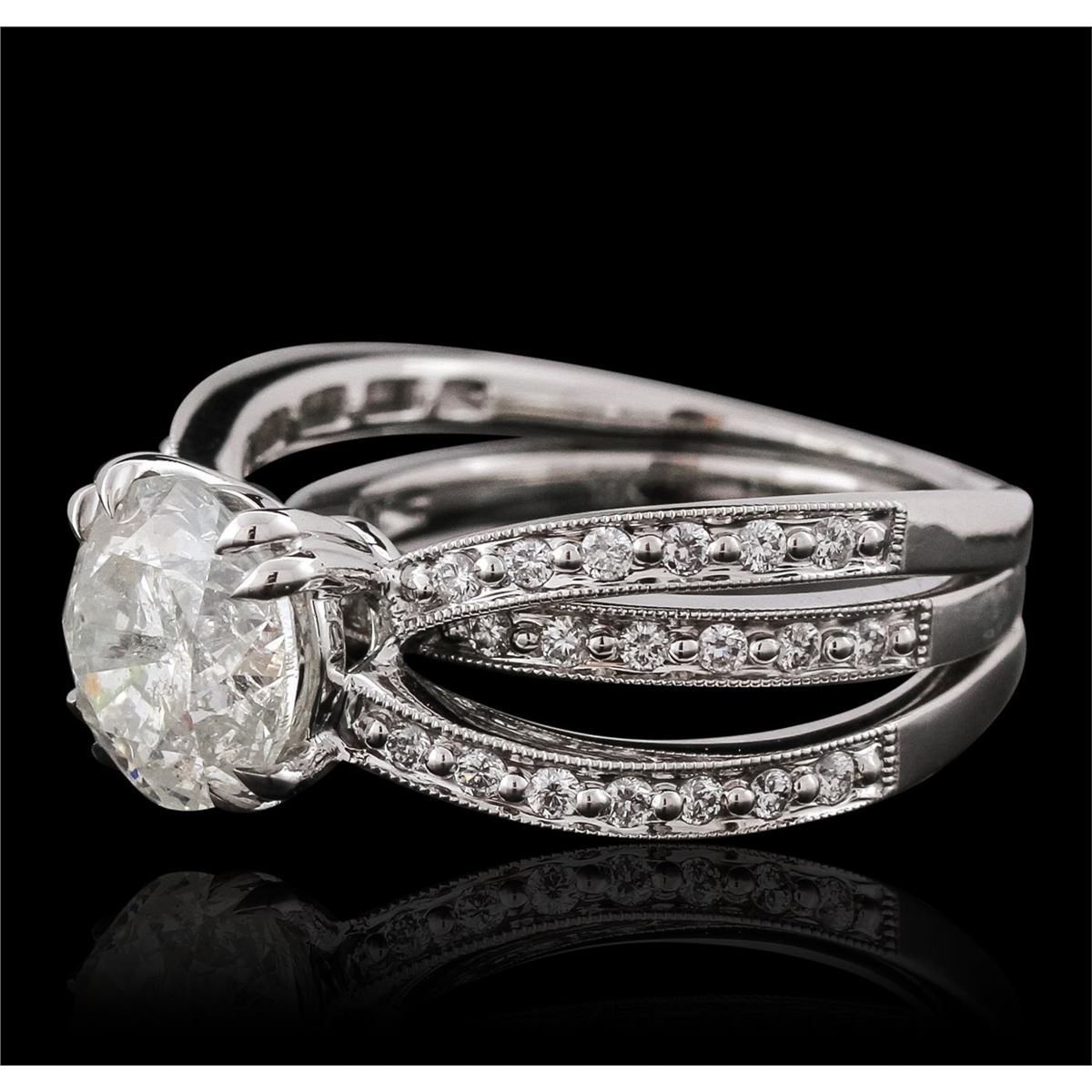 One electronically tested 18KT white gold ladies cast & assembled diamond wedding set. The wedding set includes a diamond engagement ring and a diamond wedding band. The engagement ring features a diamond supported by diamond set split shoulders. The matching wedding band slides under the engagement ring, giving the wedding set a stylized three dimensional design, Bright polish finish. with milgrain detailing. Identified with markings of "18K". Condition is new, good workmanship. Containing: One prong set round brilliant cut diamond, measuring 9.10 - 9.05 x 5.90mm (depth est.), 5.00% GTCF approximate weight of 3.21ct. Diamond Grading Report attached. Graded in the setting. Clarity: I-1. Color: 65.1%. Table 58.4%. Thirty-Nine bead set round brilliant cut diamonds, measuring 1.40 - 1.30 x 0.81mm (depth est.) approximate total weight of 39 Stones = 0.45ct. Graded in the setting. Clarity: SI-1 to I-1. Color: H - J. Total Weight of Diamonds 3.66ct. Total Weight of Wedding Set 9.94 grams. AIG Appraised at $54,805.00.