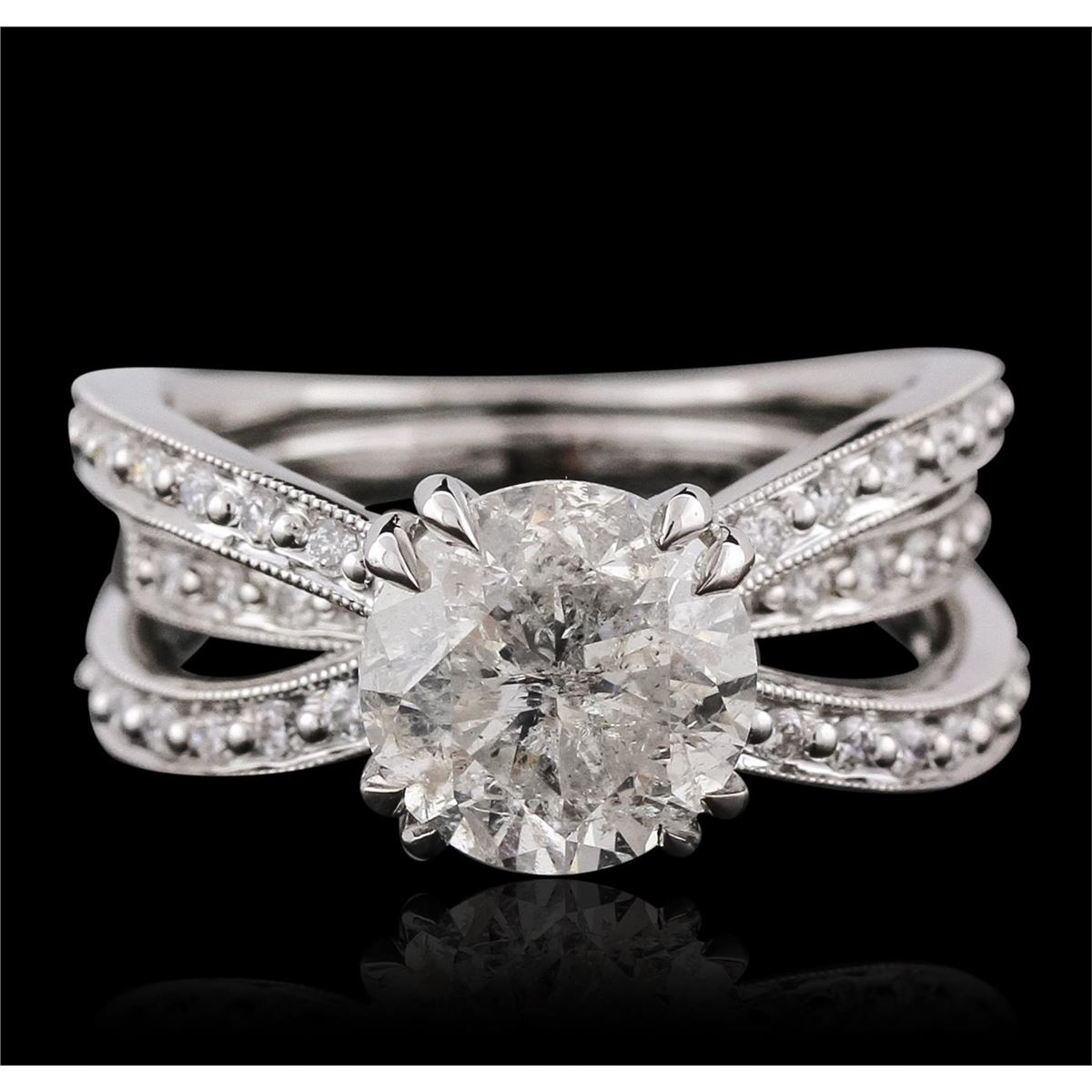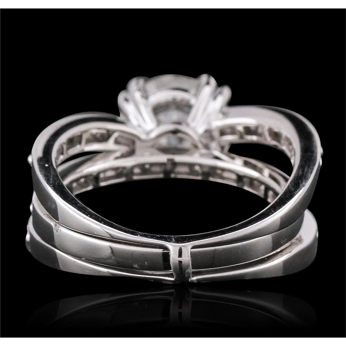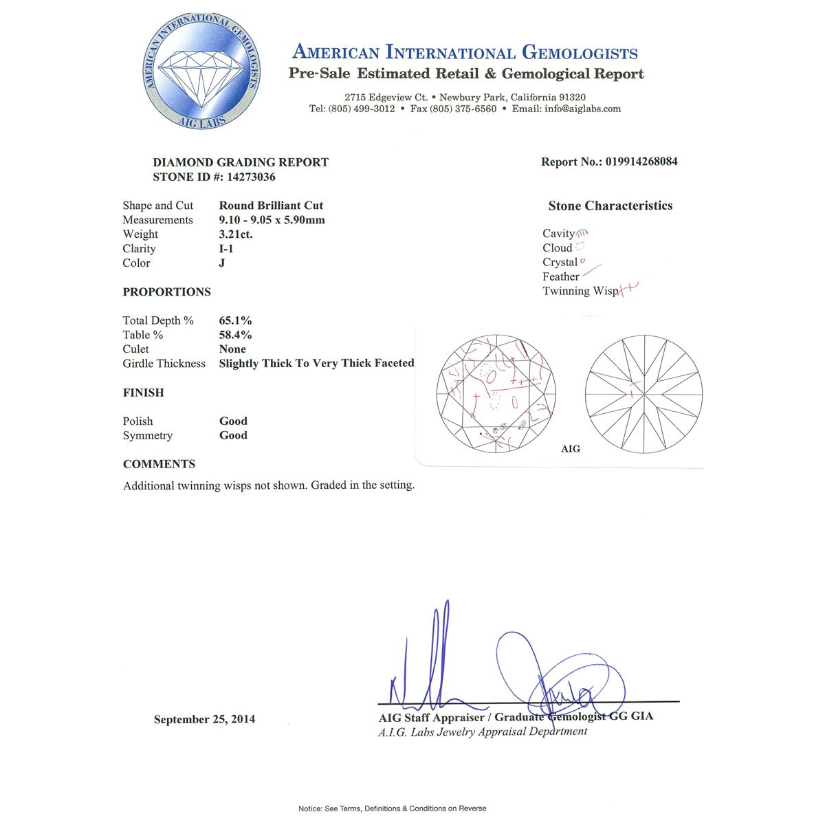 One electronically tested 18KT white gold ladies cast & assembled diamond wedding set. The wedding set includes a diamond engagement ring and a diamond wedding band. The engagement ring features a diamond supported by diamond set split shoulders. The matching wedding band slides under the engagement ring, giving the wedding set a stylized three dimensional design, Bright polish finish. with milgrain detailing. Identified with markings of "18K". Condition is new, good workmanship. Containing: One prong set round brilliant cut diamond, measuring 9.10 - 9.05 x 5.90mm (depth est.), 5.00% GTCF approximate weight of 3.21ct. Diamond Grading Report attached. Graded in the setting. Clarity: I-1. Color: 65.1%. Table 58.4%. Thirty-Nine bead set round brilliant cut diamonds, measuring 1.40 - 1.30 x 0.81mm (depth est.) approximate total weight of 39 Stones = 0.45ct. Graded in the setting. Clarity: SI-1 to I-1. Color: H - J. Total Weight of Diamonds 3.66ct. Total Weight of Wedding Set 9.94 grams. AIG Appraised at $54,805.00.