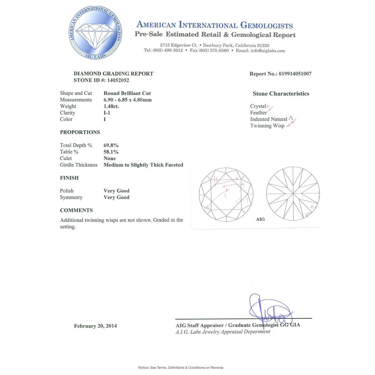 One electronically tested 18KT White Gold ladies cast & assembled diamond unity ring with a bright polish finish. Condition is good. The ring features a cathedral set diamond supported by diamond set shoulders and framed by mirroring diamond ribbons. The ring is completed by a five millimeter wide band. Identified with markings of "18K". Containing: One prong set round brilliant cut diamond, measuring 6.90 - 6.85 x 4.80mm (depth est.) approximate weight of 1.48ct. Diamond Grading Report attached. Graded in the setting. Clarity: I-1. Color: I Depth 69.8%. Table 58.1%. Sixteen invisible set princess cut diamonds, measuring 2.30 x 2.10 x 1.58mm (depth est.) approximate. Total Weight of 16 Stones = 1.10ct. Graded in the setting. Clarity: SI-1 to SI-2. Color: G - I Thirty-Two channel set princess cut diamonds, measuring 1.80 x 1.70 x 1.28mm (depth est.) approximate. Total Weight of 32 Stones = 1.12ct. Graded in the setting. Clarity: VS-1 to SI-1. Color: G - I. Total Weight of Diamonds 3.70ct. Total Weight of Ring 15.64 grams. AIG Appraised at $30,490.00.