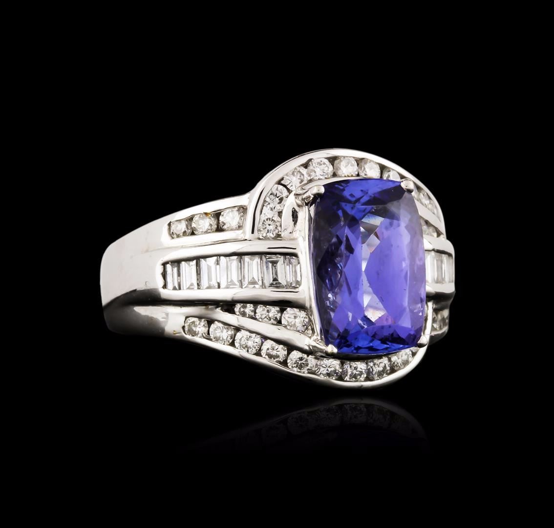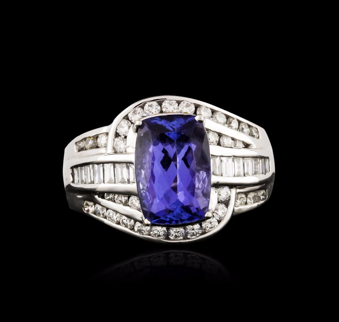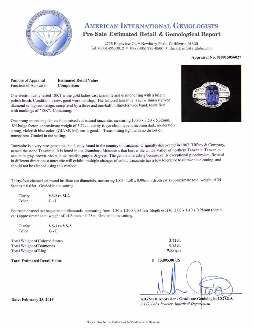 One electronically tested 18KT white gold ladies cast tanzanite and diamond ring with a bright polish finish. The featured tanzanite is set within a stylized diamond set bypass design, completed by a three and one-half millimeter wide band. Identified with markings of "18K". Condition is new, good workmanship. Containing: One prong set rectangular cushion mixed cut natural tanzanite, measuring 10.90 x 7.50 x 5.32mm, 8%. bulge factor, approximate weight of 3.72ct., clarity is eye clean, type I, medium dark, moderately strong, violetish blue color, (GIA vB 6/4), cut is good. Transmitting light with no distortion, transparent. Graded in the setting. Tanzanite is a very rare gemstone that is only found in the country of Tanzania. Originally discovered in 1967. Tiffany & Company, named the stone Tanzanite. It is found in the Usumburu Mountains that border the Umba Valley of northern Tanzania. Tanzanite occurs in gray, brown, violet, blue, reddish-purple, & green. The gem is interesting because of its exceptional pleochroism. Rotated in different directions a tanzanite will exhibit multiple changes of color. Tanzanite has a low tolerance to ultrasonic cleaning, and should not be cleaned using this method. Thirty-Four channel set round brilliant cut diamonds, measuring 1.80 - 1.50 x 0.99mm (depth est.) approximate total weight of 34 Stones = 0.65ct. Graded in the setting. Clarity: VS-2 to SI-2. Color: G - I Fourteen channel set baguette cut diamonds, measuring from 1.80 x 1.20 x 0.84mm (depth est.) to 2.00 x 1.40 x 0.98mm (depth est.) approximate total weight of 14 Stones = 0.28ct. Graded in the setting. Clarity: VS-1 to VS-2. Color: G - I. Total Weight of Colored Stones 3.72ct. Total Weight of Diamonds 0.93ct. Total Weight of Ring 9.55 grams. AIG Appraised at $13,895.00.