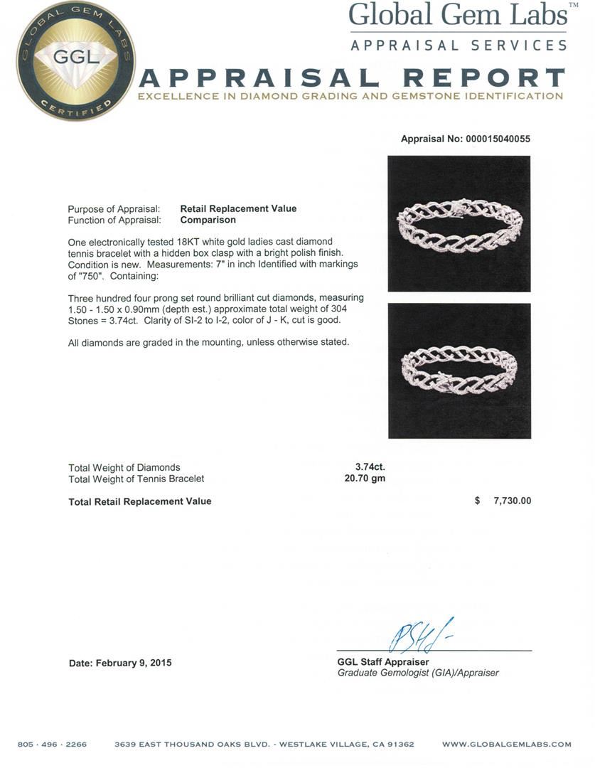 One electronically tested 18KT white gold ladies cast diamond tennis bracelet with a hidden box clasp with a bright polish finish. Measurements: 7" in inch Identified with markings of "750". Condition is new. Containing: Three hundred four prong set round brilliant cut diamonds, measuring 1.50 x 1.50 x 0.90mm (depth est.) approximate total weight of 304 Stones = 3.74ct. Clarity: SI-2 to I-2. Color: J - K, Cut is Good. All diamonds are graded in the mounting, unless otherwise stated. Total Weight of Diamonds 3.74ct. Total Weight of Tennis Bracelet 20.70 grams. GGL Appraised at $7,730.00.