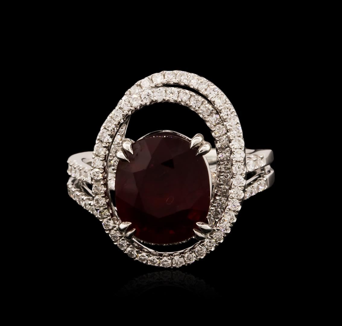 One electronically tested 18KT white gold ladies cast ruby and diamond ring with a bright polish finish. Identified with markings of "18K". Condition is new. Containing: One prong set oval modified brilliant cut natural ruby, measuring 11.00 x 8.00 x 5.20mm, approximate weight of 3.89ct., clarity is heavily included, medium dark, moderately strong, strongly purplish red color, (GIA stpR 6/4), cut is good. One Hundred prong set round brilliant cut diamonds, measuring 1.10 - 1.10 x 0.66mm (depth est.) approximate total weight of 100 Stones = 0.48ct. Clarity: SI-2 to I-1. Color: I - J, Cut is Good. Colored gemstones are presumed to have been subjected to commonly used enhancement processes, All diamonds and colored gemstones are graded in the mounting, unless otherwise stated. Total Weight of Colored Stones 3.89ct. Total Weight of Diamonds 0.48ct. Total Weight of Ring 8.90 grams. GGL Appraised at $4,595.00.